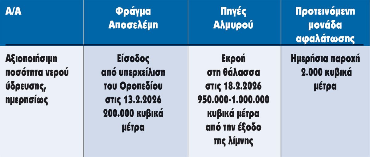 - Υπάρχει ακόμη πρόβλεψη για διάνοιξη νέων γεωτρήσεων -δύο άμεσα και κάποιες άλλες στο μέλλον- οι οποίες θα έπρεπε να είχαν διανοιχθεί προ πολλού, δεδομένου ότι η επερχόμενη λειψυδρία ήταν προβλέψιμη.