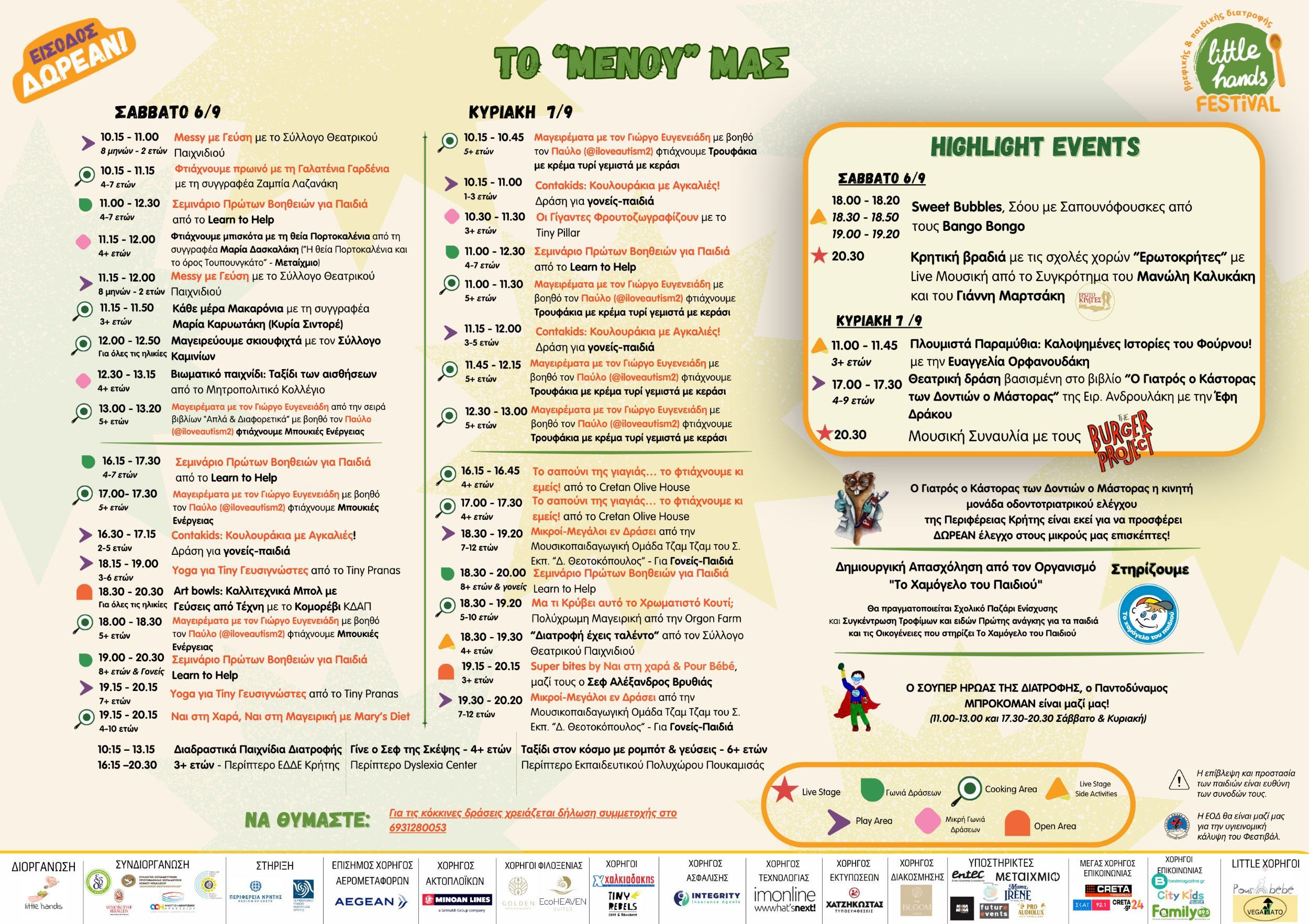 Το Little Hands Festival ανοίγει τις πόρτες του το Σάββατο 6 και την Κυριακή 7 Σεπτεμβρίου στο Παγκρήτιο Στάδιο. Ελάτε να ζήσουμε μαζί δύο ημέρες γεμάτες γεύσεις, παιχνίδια και χαμόγελα!