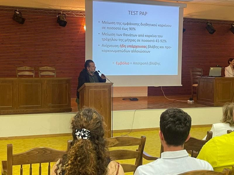 Επιπλέον, η Προϊσταμένη Δ/νσης Δημόσιας Υγείας της 7ης Υ.ΠΕ. Κρήτης, Εύη Γαρεδάκη, παρουσίασε το πρόγραμμα «ΠΡΟΛΑΜΒΑΝΩ» για τον καρκίνο του τραχήλου της μήτρας, ενημερώνοντας το κοινό για τις δυνατότητες που προσφέρει το πρόγραμμα για την έγκαιρη ανίχνευση της νόσου.