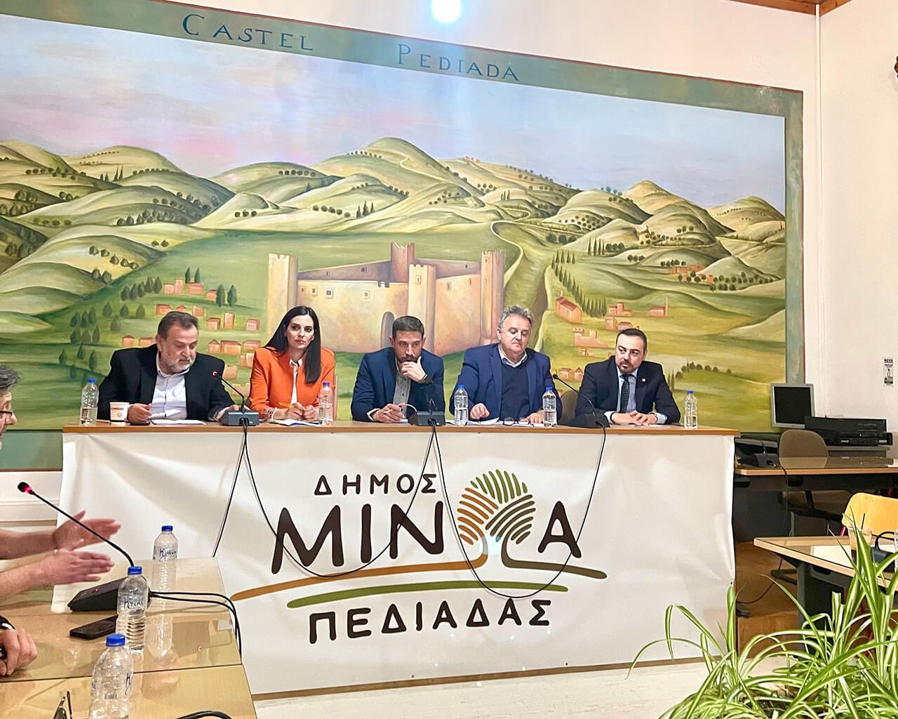 Ο οικοδεσπότης της εκδήλωσης, δήμαρχος Μινώα Βασίλης Κεγκέρογλου, σημείωσε πως ο δήμος έχει θέσει σε προτεραιότητα την ανασυγκρότηση της περιοχής με βάση τις προκλήσεις που αντιμετωπίζει: Τα προβλήματα από τον καταστροφικό σεισμό και την κατασκευή του νέου Α/Δ στο Καστέλλι.