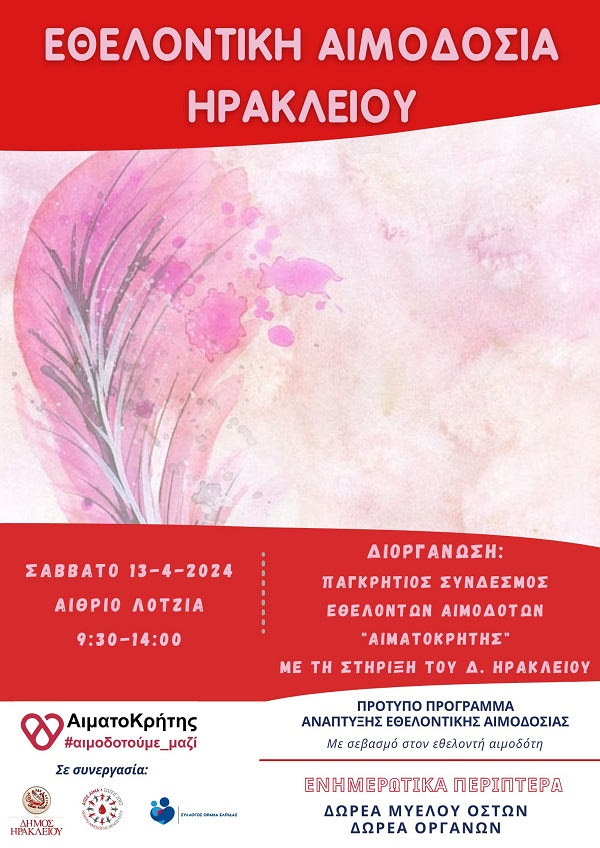 Το Σάββατο 13/04/2024 θα πραγματοποιηθεί εθελοντική αιμοδοσία στο κέντρο της πόλης του Ηρακλείου και συγκεκριμένα στο αίθριο της Λότζια από τις 9:30 έως τις 14:00.