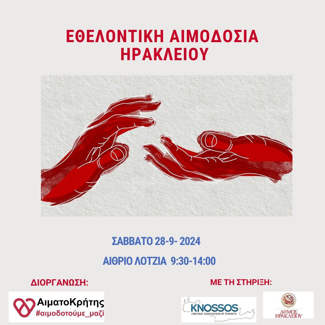 Η εθελοντική αιμοδοσία πραγματοποιείται κάθε Σάββατο. Πρόκειται για μια κοινή προσπάθεια αιμοδοσίας, την οποία διοργανώνει ο Παγκρήτιος Σύνδεσμος Εθελοντών Αιμοδοτών και Δωρητών Οργάνων Σώματος «Αιματοκρήτης», με τη στήριξη του Δήμου Ηρακλείου. Σε αυτή την κοινή προσπάθεια, καλούνται όλοι να συμμετάσχουν.