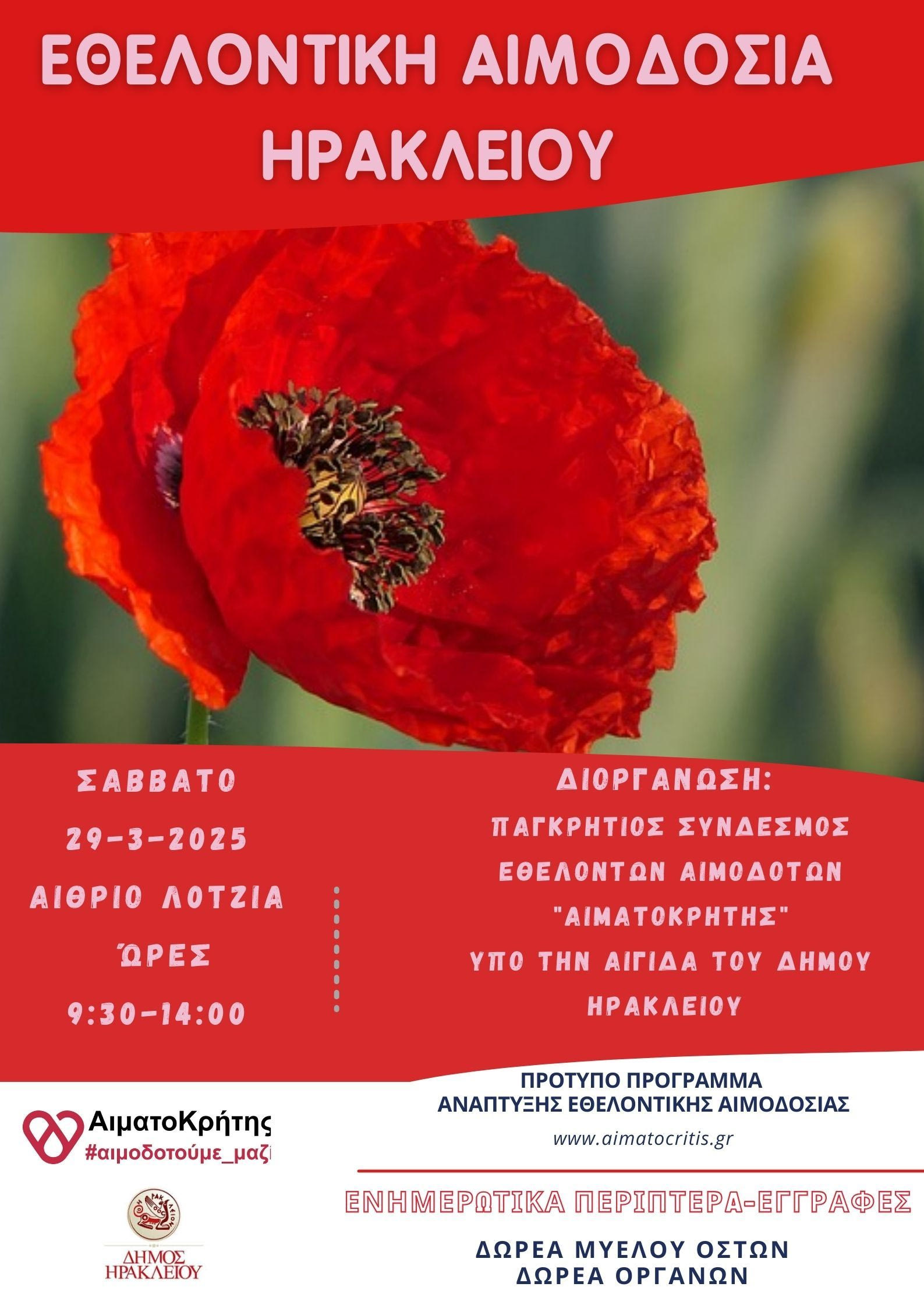 Το Σάββατο 29 Μαρτίου 2025 θα πραγματοποιηθεί εθελοντική αιμοδοσία στο κέντρο της πόλης του Ηρακλείου και συγκεκριμένα στο αίθριο της Λότζια από τις 09:30 έως τις 14:00.