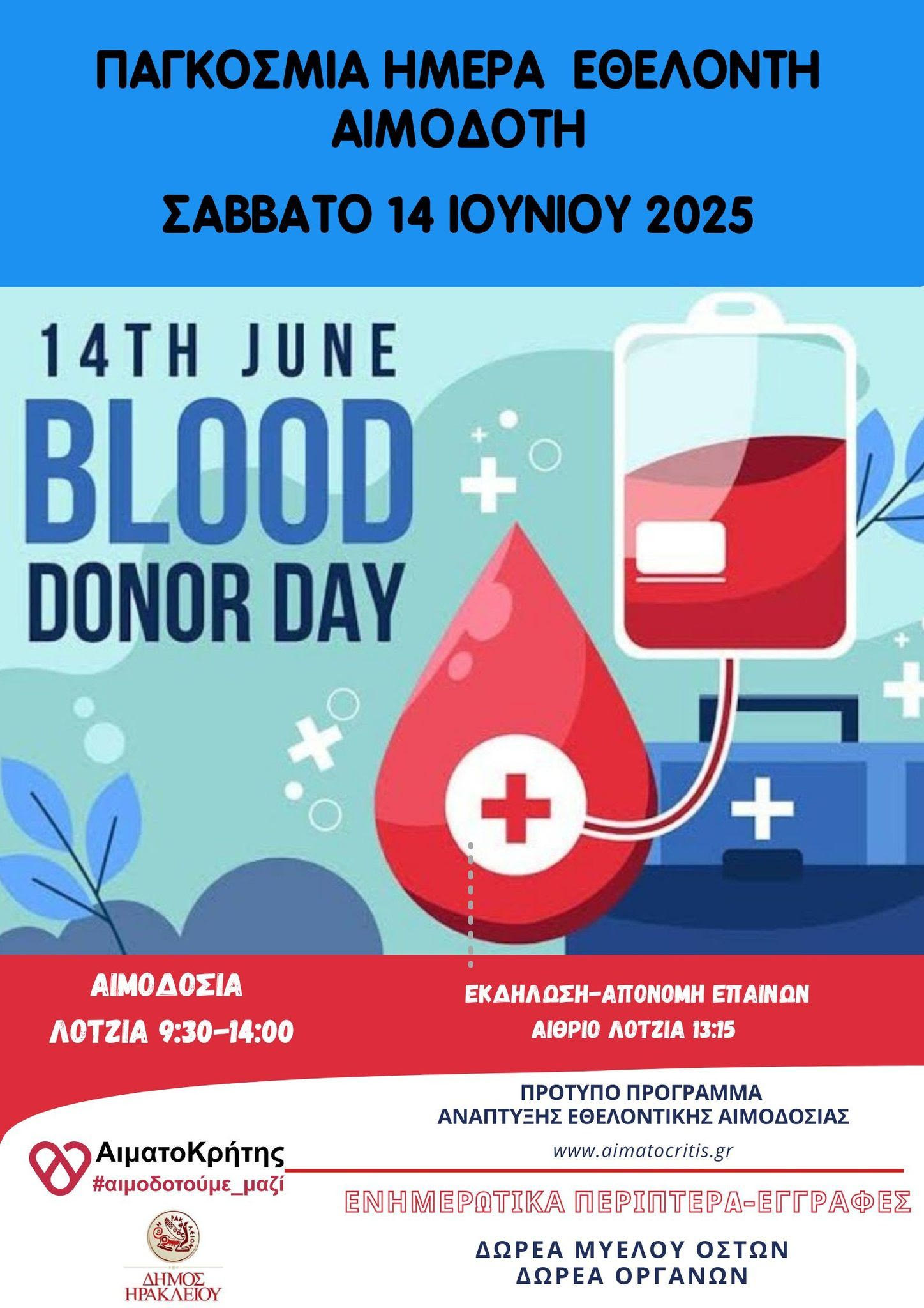 Το Σάββατο 14 Iουνίου 2025 Παγκόσμια Ημέρα Εθελοντή Αιμοδότη θα πραγματοποιηθεί εθελοντική αιμοδοσία στο κέντρο της πόλης του Ηρακλείου και συγκεκριμένα στο αίθριο της Λότζια από τις 09:30 έως τις 14:00. Παράλληλα στις 13:15 μμ στον ίδιο χώρο θα πραγματοποιηθεί εκδήλωση απονομής επαίνων.