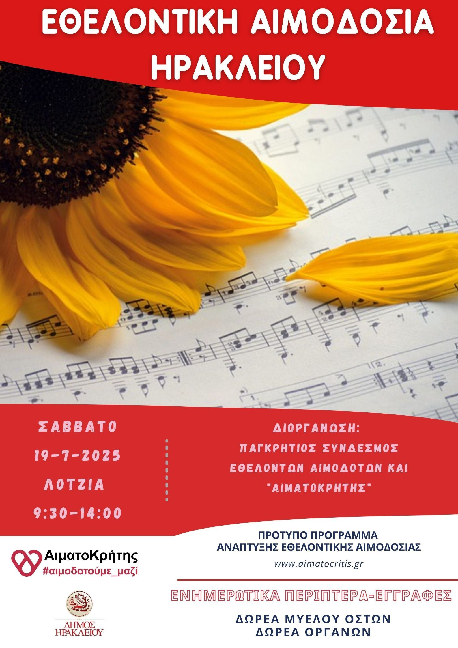 Το Σάββατο 19 Ιουλίου 2025 θα πραγματοποιηθεί εθελοντική αιμοδοσία στο κέντρο της πόλης του Ηρακλείου και συγκεκριμένα στο αίθριο της Λότζια από τις 09:30 έως τις 14:00.