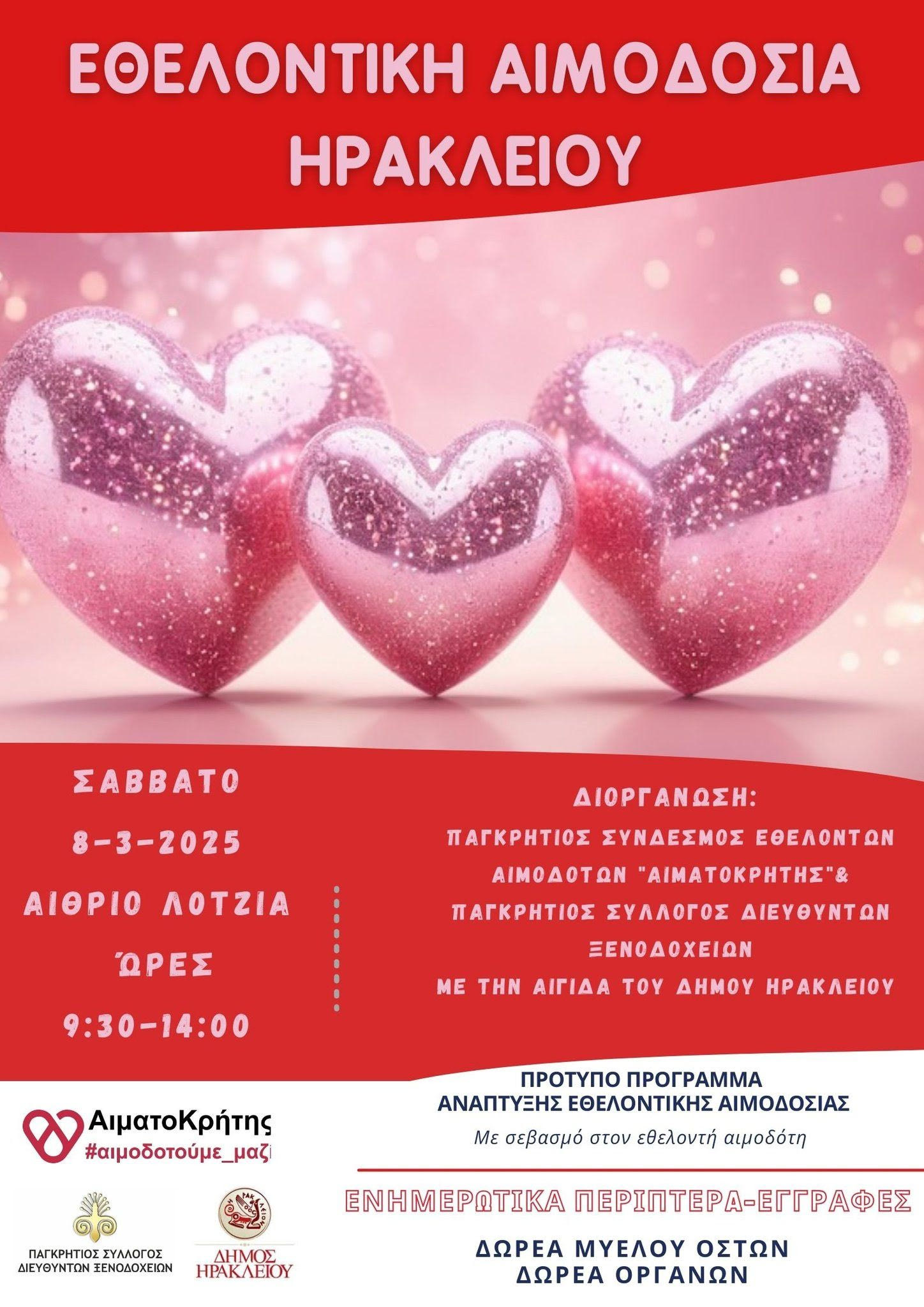 Το Σάββατο 8 Μαρτίου θα πραγματοποιηθεί εθελοντική αιμοδοσία στο κέντρο της πόλης του Ηρακλείου και συγκεκριμένα στο αίθριο της Λότζια από τις 09:30 έως τις 14:00.