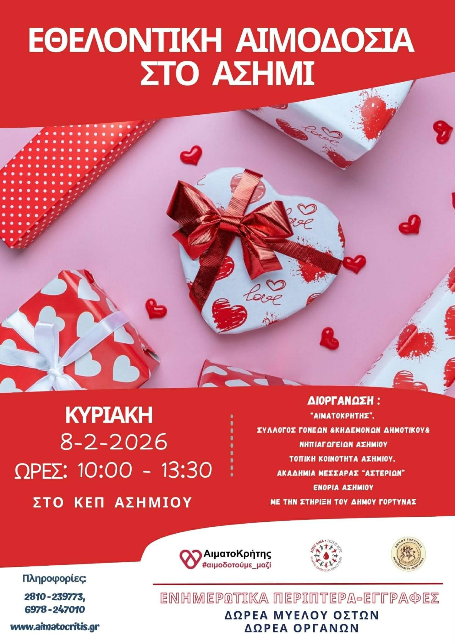 Ο Παγκρήτιος Σύνδεσμος Εθελοντών Αιμοδοτών «Αιματοκρήτης», ο Σύλλογος Γονέων και Κηδεμόνων Δημοτικού και Νηπιαγωγείων Ασημίου, η Κοινότητα και η Ενορία Ασημίου και η Ακαδημία Ποδοσφαίρου Μεσαράς «Αστερίωνας», με την στήριξη του Δήμου Γόρτυνας, διοργανώνουν εθελοντική αιμοδοσία την Κυριακή 8 Φεβρουαρίου 2026, ώρες 10:00 – 13:30, στο ΚΕΠ Ασημίου.
