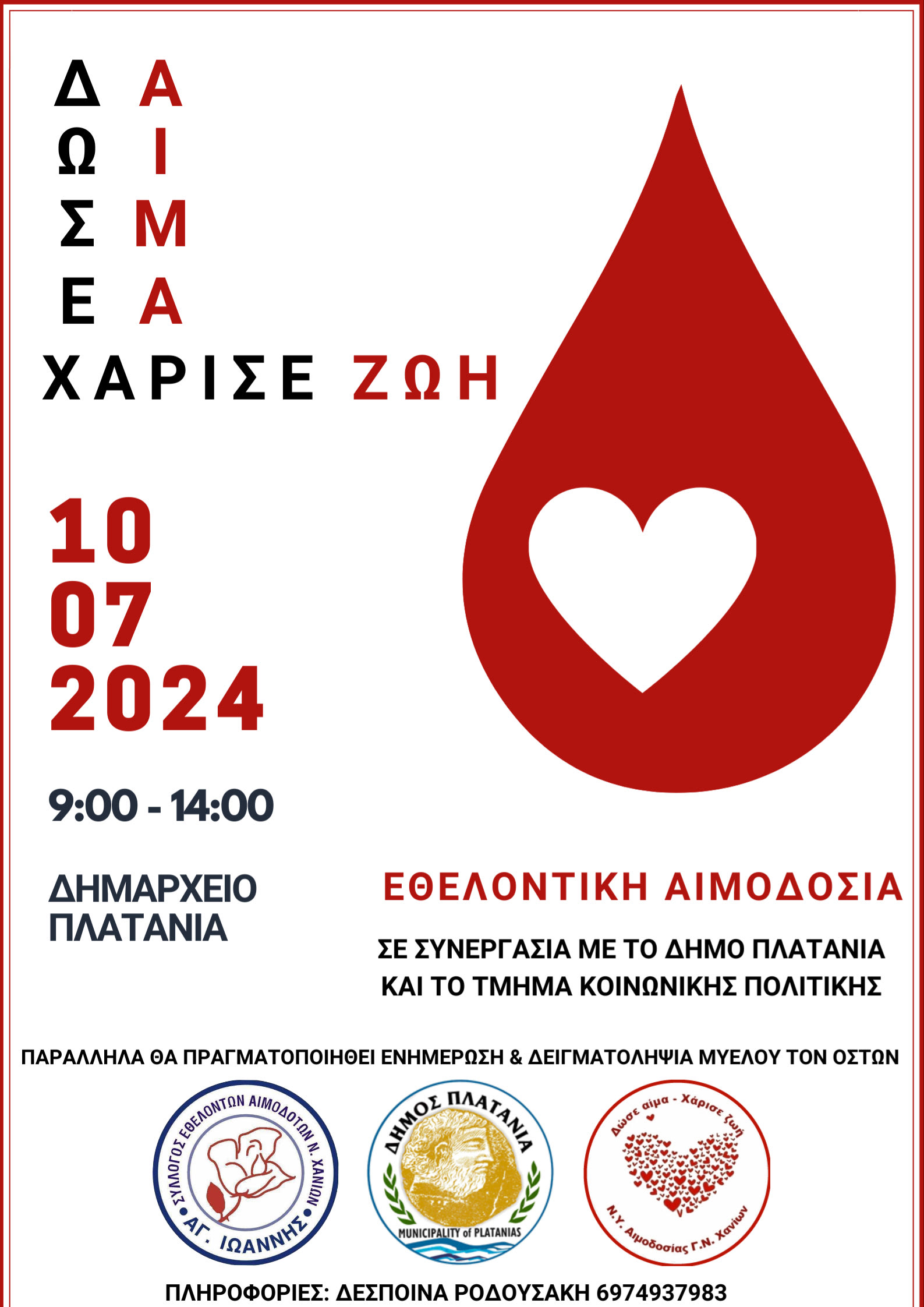 Ο Δήμος Πλατανιά, και ο Σύλλογος Εθελοντών Αιμοδοτών Νομού Χανίων ο “Άγιος Ιωάννης” σε συνεργασία με το Τμήμα Αιμοδοσίας του Γ. Νοσοκομείου Χανίων ο “Άγιος Γεώργιος”, θα πραγματοποιήσουν την Τετάρτη 10 Ιουλίου 2024, εθελοντική αιμοδοσία στο Δημαρχείο Πλατανιά (στο Γεράνι) από τις 09:00π.μ. έως τις 14:00μ.μ.