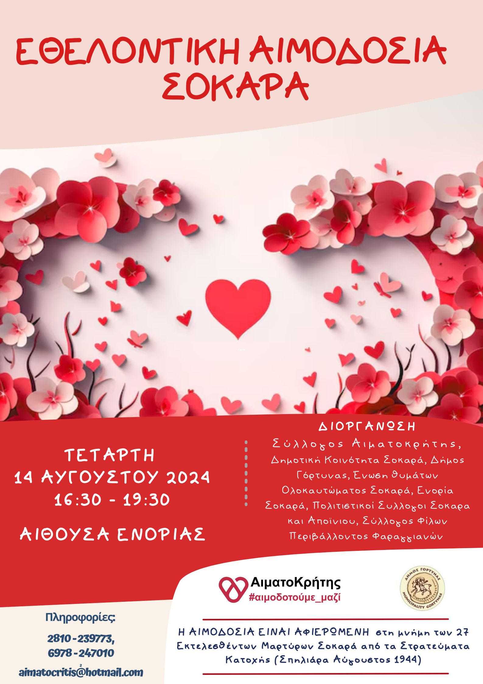 Την αιμοδοσία διοργανώνει ο Παγκρήτιος Σύνδεσμος Εθελοντών Αιμοδοτών και Δωρητών Οργάνων Σώματος «Αιματοκρήτης» μαζί με την Δημοτική Ενότητα Σοκαρά, την Ενορία Σοκαρά, τους πολιτιστικούς συλλόγους Σοκαρά και Αποϊνίου, το σύλλογο φίλων περιβάλλοντος Φαραγγιανών και την Ένωση θυμάτων Ολοκαυτώματος Σοκαρά.