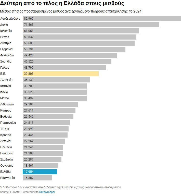 Στον αντίποδα, σύμφωνα με τα στοιχεία της Eurostat, η Βουλγαρία, η Ελλάδα και η Ουγγαρία είχαν τους χαμηλότερους μισθούς εντός του 2024. Ένας μέσος απασχολούμενος στη Βουλγαρία έλαβε 15/387 ευρώ, ενώ στην Ελλάδα 17.954 ευρώ.