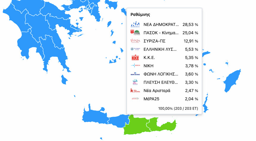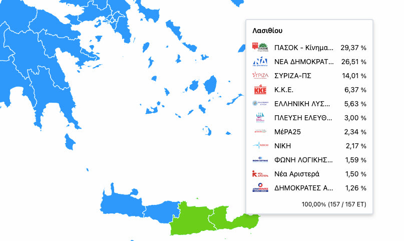 Στο 33,98% εκτόξευσε το ποσοστό του το ΠΑΣΟΚ αφήνοντας πίσω του τη Ν.Δ. στο 25,22%. Ακολουθεί ο ΣΥΡΙΖΑ με 12,43%, και αμέσως μετά το ΚΚΕ με 6,37%. Στην πέμπτη θέση η Ελληνική Λύση με ποσοστό 5,75% .
