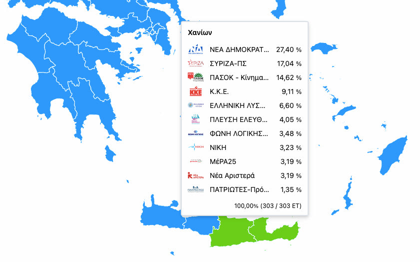 Την ίδια στιγμή η δυτική πλευρά του νησιού σε Ρέθυμνο και Χανιά παραμένει βαμμένη στα γαλάζια, αλλά με απώλειες της δύναμης της Ν.Δ. σε σχέση με την εθνική κάλπη και μεγαλύτερη αντιστοιχία στα ποσοστά των ευρωεκλογών του 2019. Έτσι η επόμενη μέρα των εκλογών βρίσκει την Κρήτη μισή πράσινη μισή γαλάζια και με νέα δεδομένα σε σχέση με την κατανομή στην εκλογική δύναμη των κομμάτων.