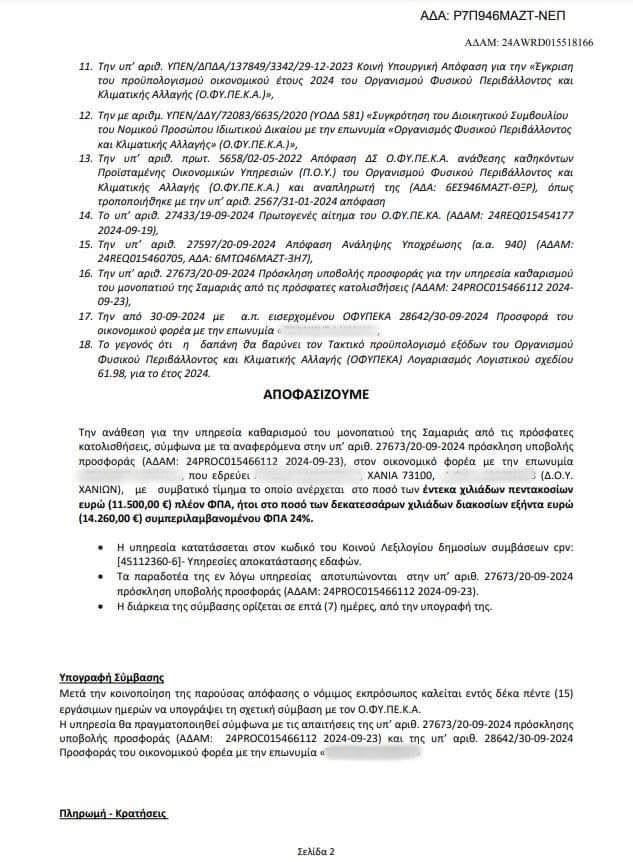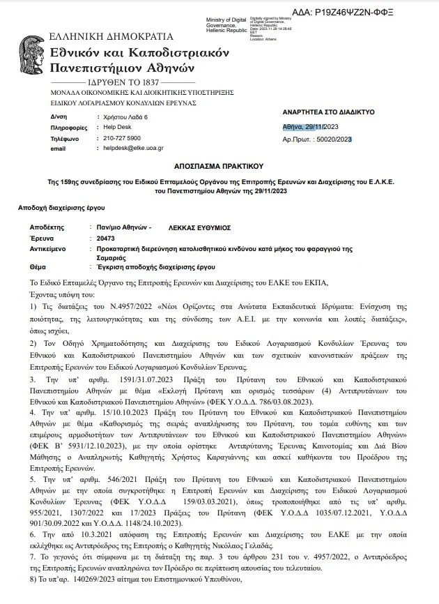 Η συγκεκριμένη ανατέθηκε στο ΕΚΠΑ, με επιστημονικά υπεύθυνο τον κ. Λέκκα, και αναρτήθηκε στην Διαύγεια τον Νοέμβριο του 2023, με τον συνολικό προϋπολογισμό του έργου να είναι 29.500 ευρώ.