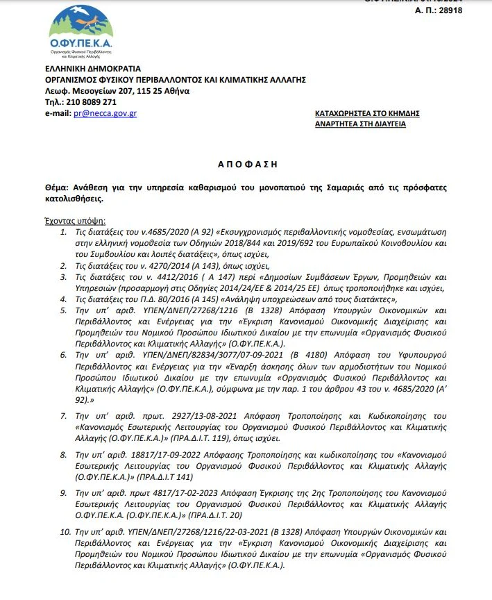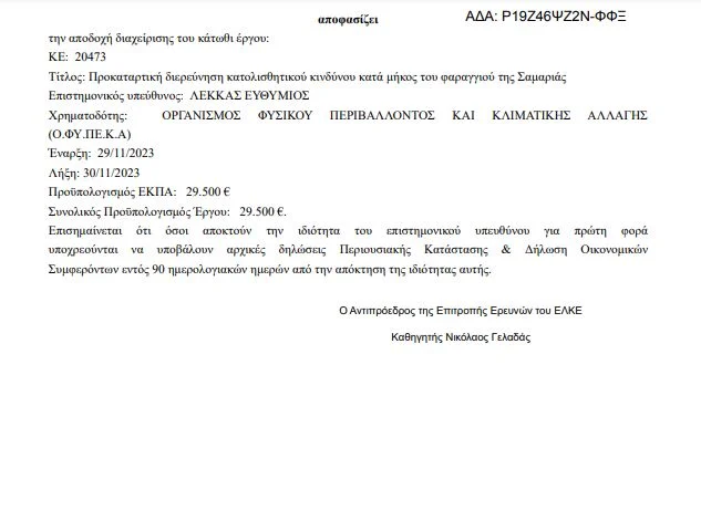 Μετά τις αυτοψίες ειδικών κλιμακίων, αποφασίστηκε η υπογραφή προγραμματικής σύμβασης μεταξύ του Οργανισμού Φυσικού Περιβάλλοντος και Κλιματικής Αλλαγής (ΟΦΥΠΕΚΑ), που είναι ο αρμόδιος φορέας λειτουργίας του φαραγγιού και του ΕΚΠΑ η οποία αφορά στην «μείωση του κινδύνου κατολισθήσεων στο φαράγγι της Σαμαριάς».