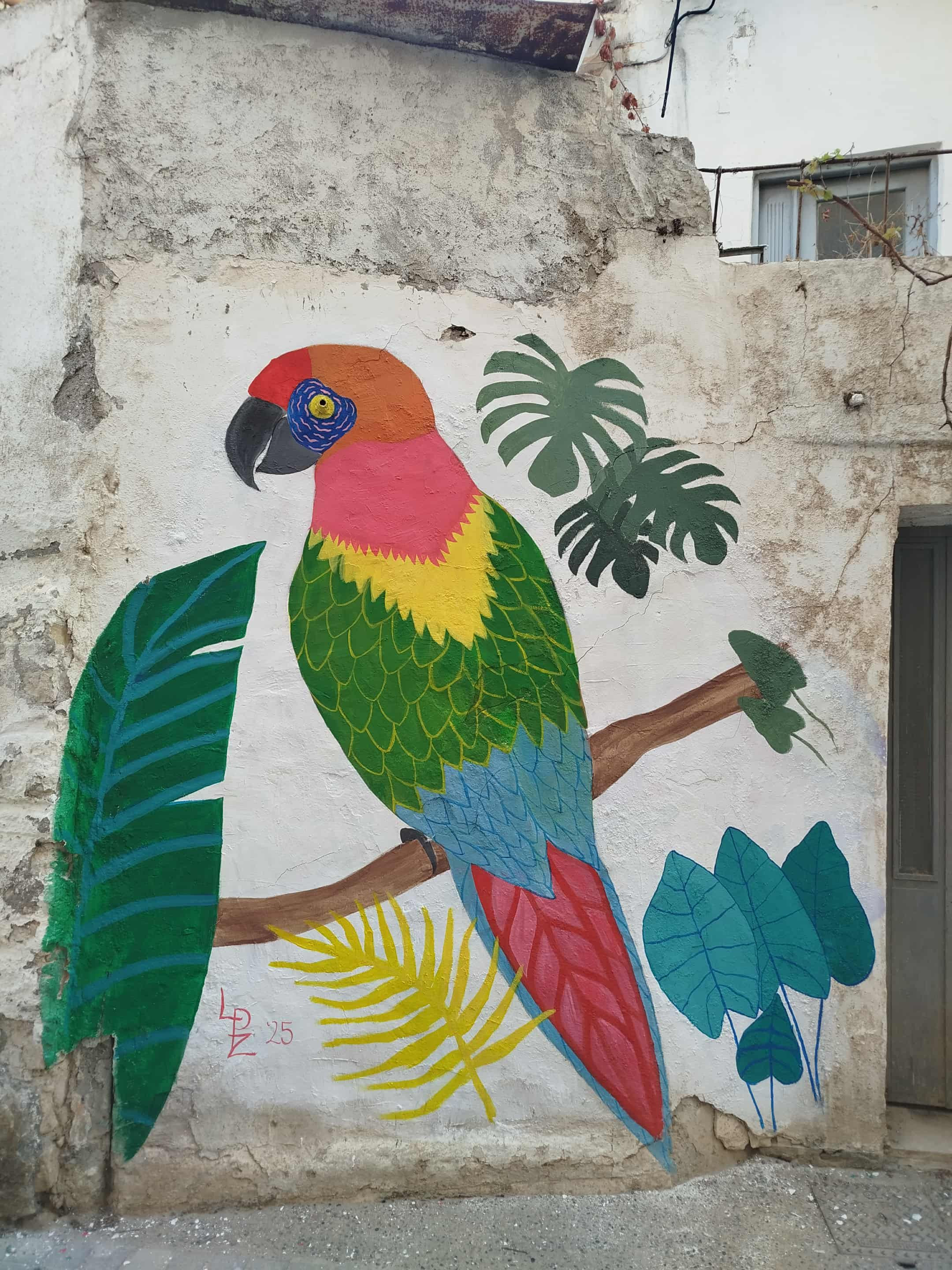 Από τα σχολικά θρανία στα χρώματα των τοίχων: η Καρίνα Ιμπάνες, καθηγήτρια ισπανικών στο Ευρωπαϊκό Σχολείο Ηρακλείου από το 2019, έδωσε τους τελευταίους μήνες -από τον Ιούλιο συγκεκριμένα- μια απρόσμενα εξωτική νότα σε εγκαταλελειμμένα ή και κατοικημένα σπίτια. Με στίχους στο μυαλό και χρώμα στο πινέλο, μετέτρεψε φθαρμένες όψεις σε μικρά αφιερώματα μνήμης από τον τόπο της.