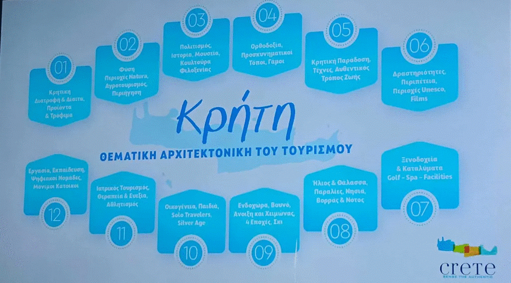 Ακολούθως, παρουσίασε τον στρατηγικό προγραμματισμό της Περιφέρειας Κρήτης για την περίοδο 2024 – 2028, επισημαίνοντας ότι η καμπάνια τουριστικής προβολής της Κρήτης για το 2024, συνολικού προϋπολογισμού 1,5 εκατ. ευρώ, που περιλαμβάνει μια σειρά από δράσεις, προωθητικές ενέργειες και συμμετοχές σε διεθνείς εκθέσεις, έχει τίτλο «Crete, take me on a story…» και περιλαμβάνει 12 θεματικές.