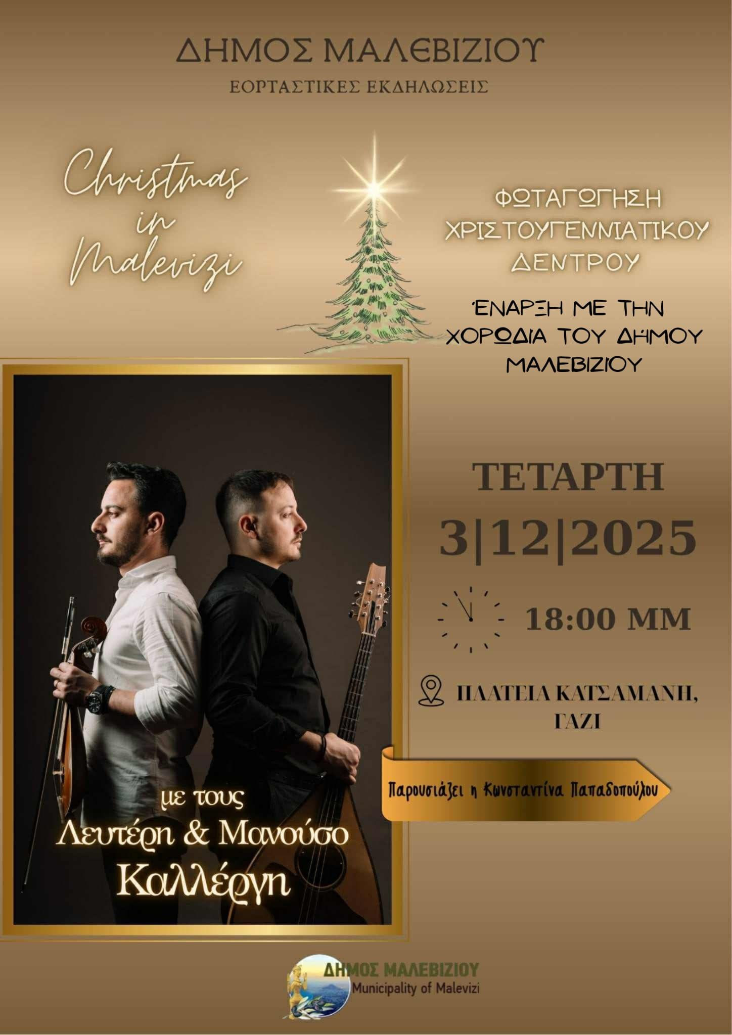 Την Τετάρτη 3 Δεκεμβρίου, στην πλατεία Μιχ. Κατσαμάνη στο Γάζι, ο Δήμος Μαλεβιζίου θα φωταγωγήσει το Χριστουγεννιάτικο Δέντρο, δίνοντας το επίσημο έναυσμα για ένα πλούσιο πρόγραμμα εορταστικών εκδηλώσεων που θα διαρκέσουν καθ’ όλη τη διάρκεια των Χριστουγέννων.