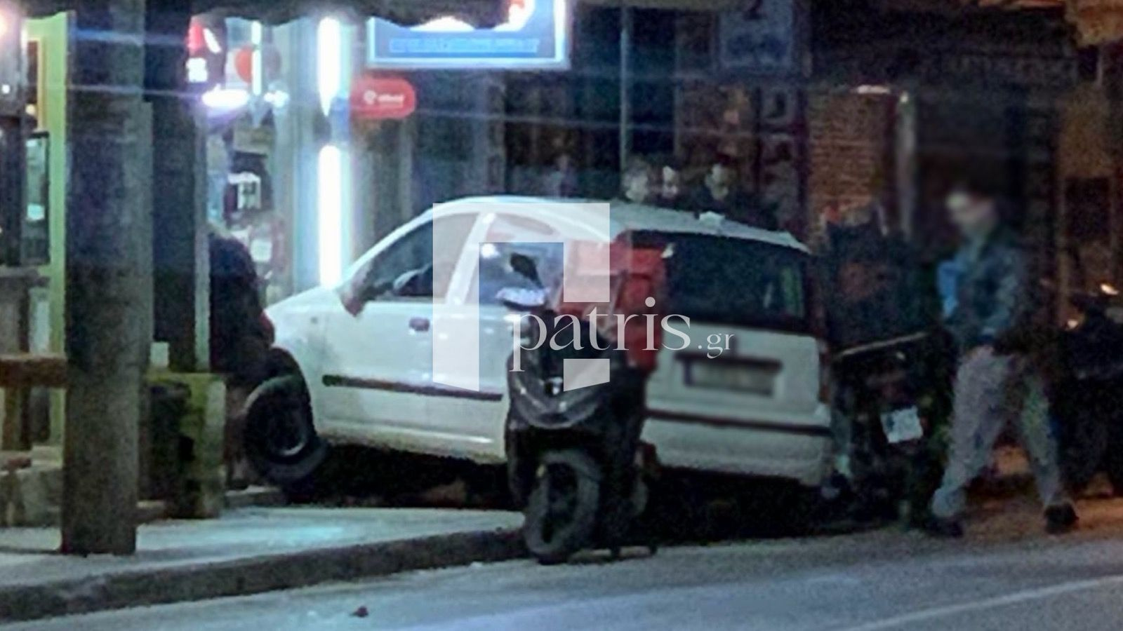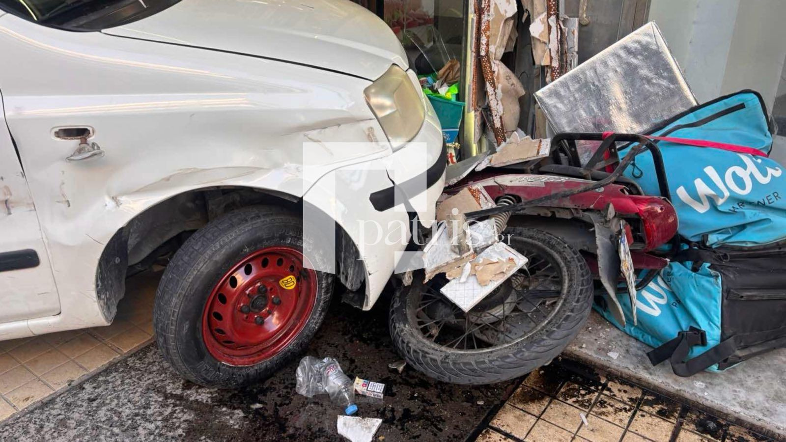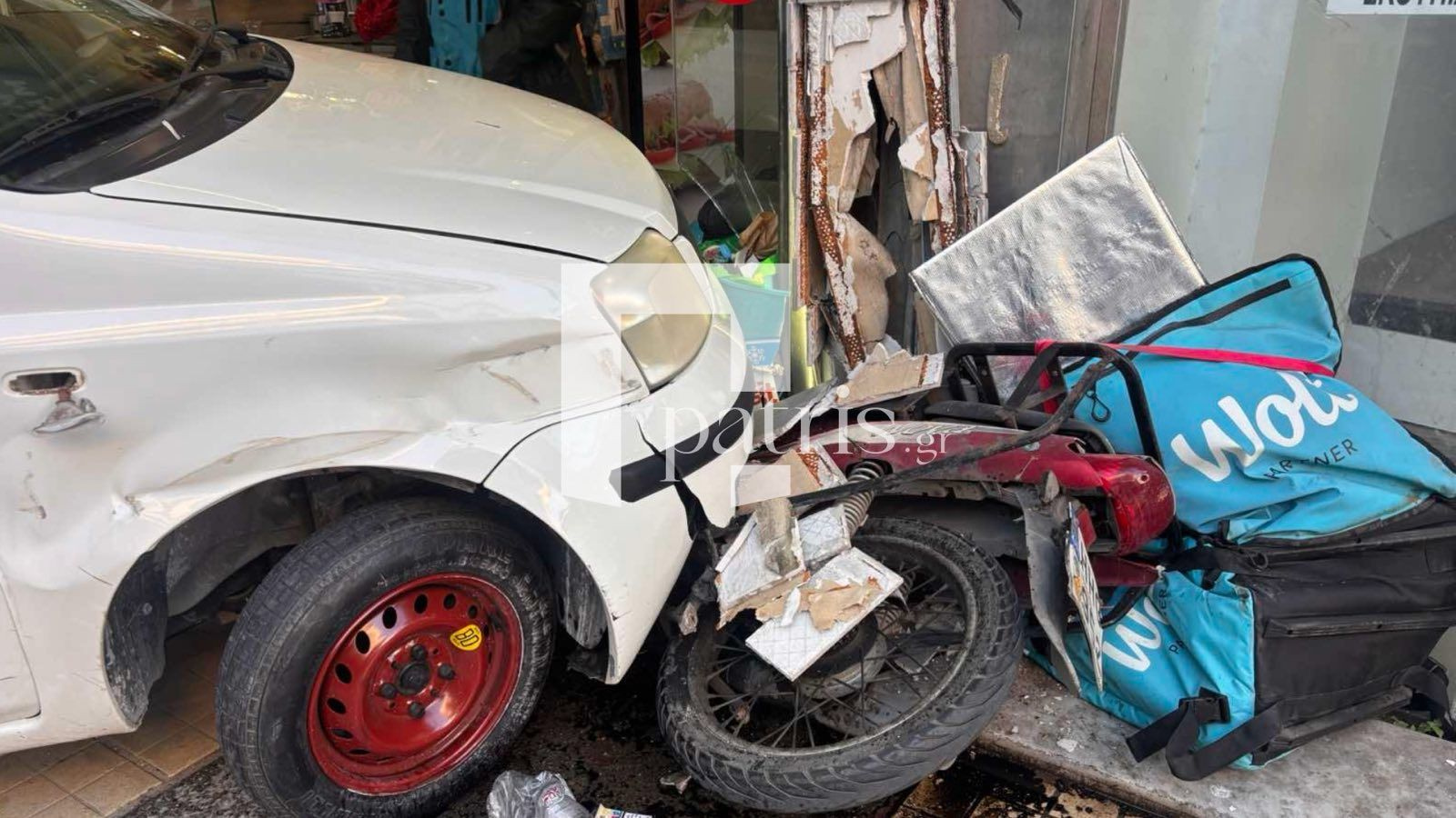 Ενα ΙΧ “καρφώθηκε” σε βιτρίνα καταστήματος, αφού πρώτα προσέκρουσε σε σταθμευμένο μηχανάκι.