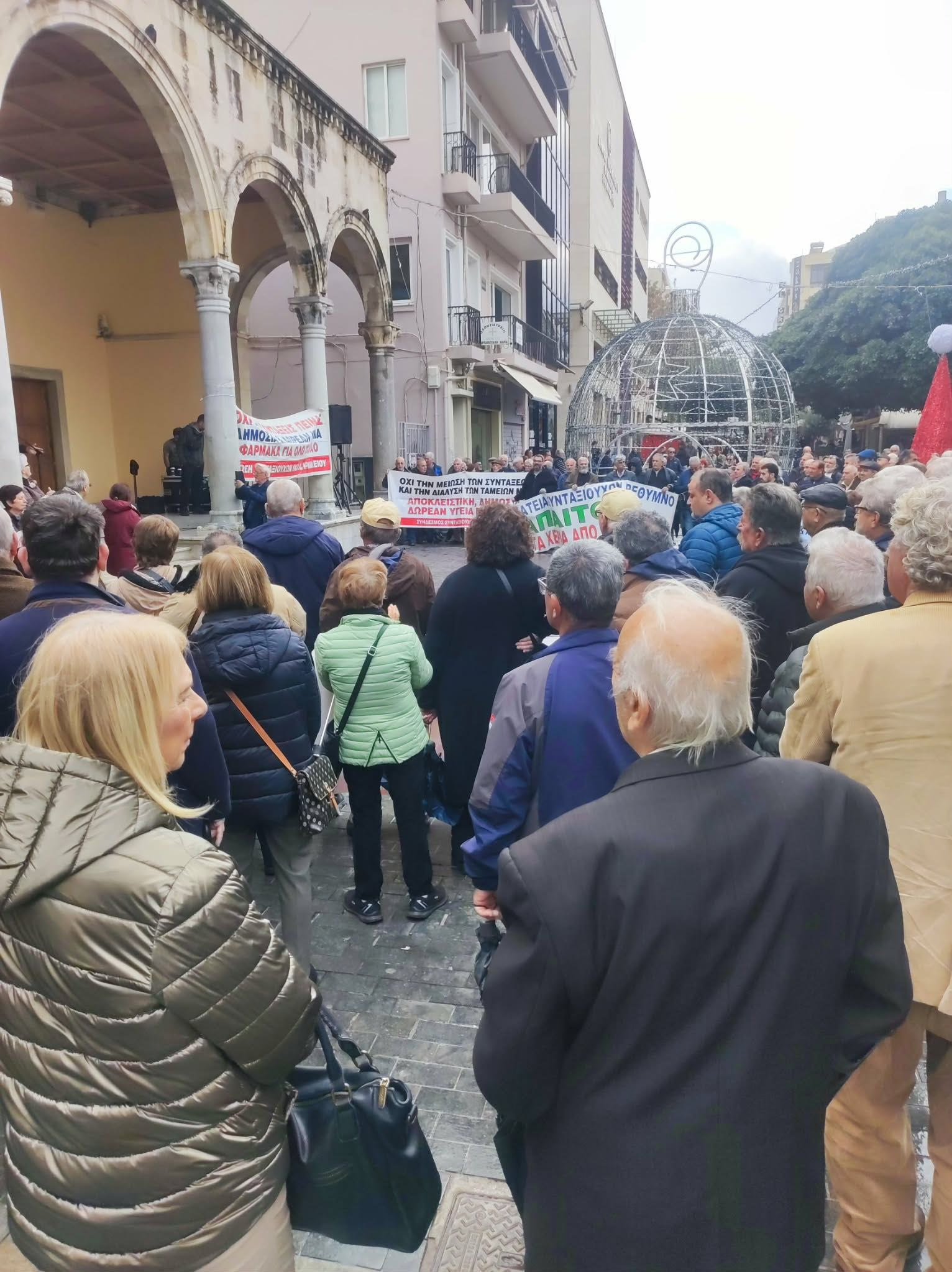 Οι συγκεντρωμένοι διαμαρτυρήθηκαν για τον αποδεκατισμό των συντάξεων, την ακρίβεια στα βασικά αγαθά, την αποδόμηση των παροχών του ΕΣΥ και την αυξημένη φορολογία επί των συντάξεων.