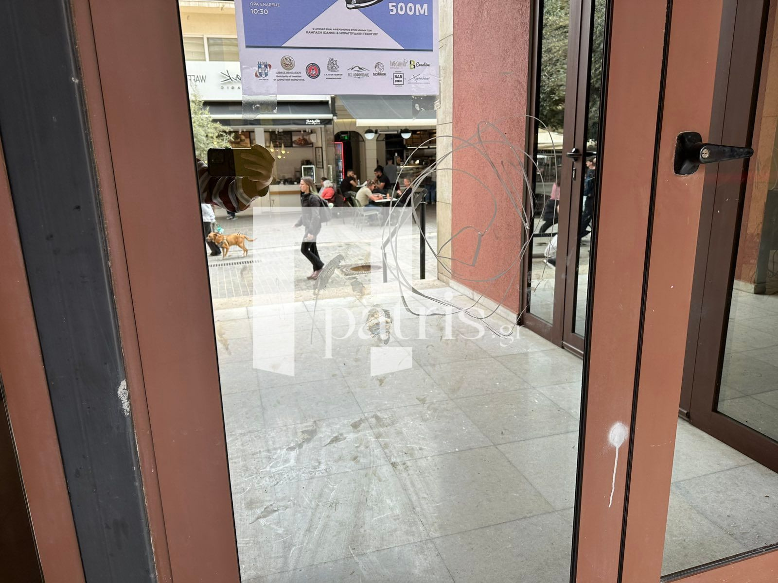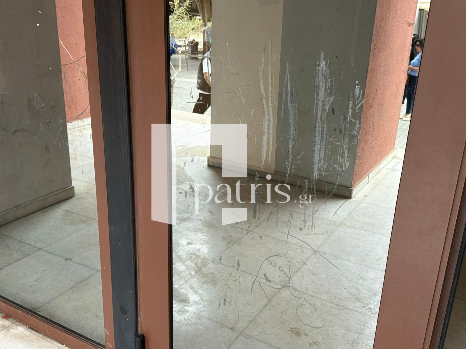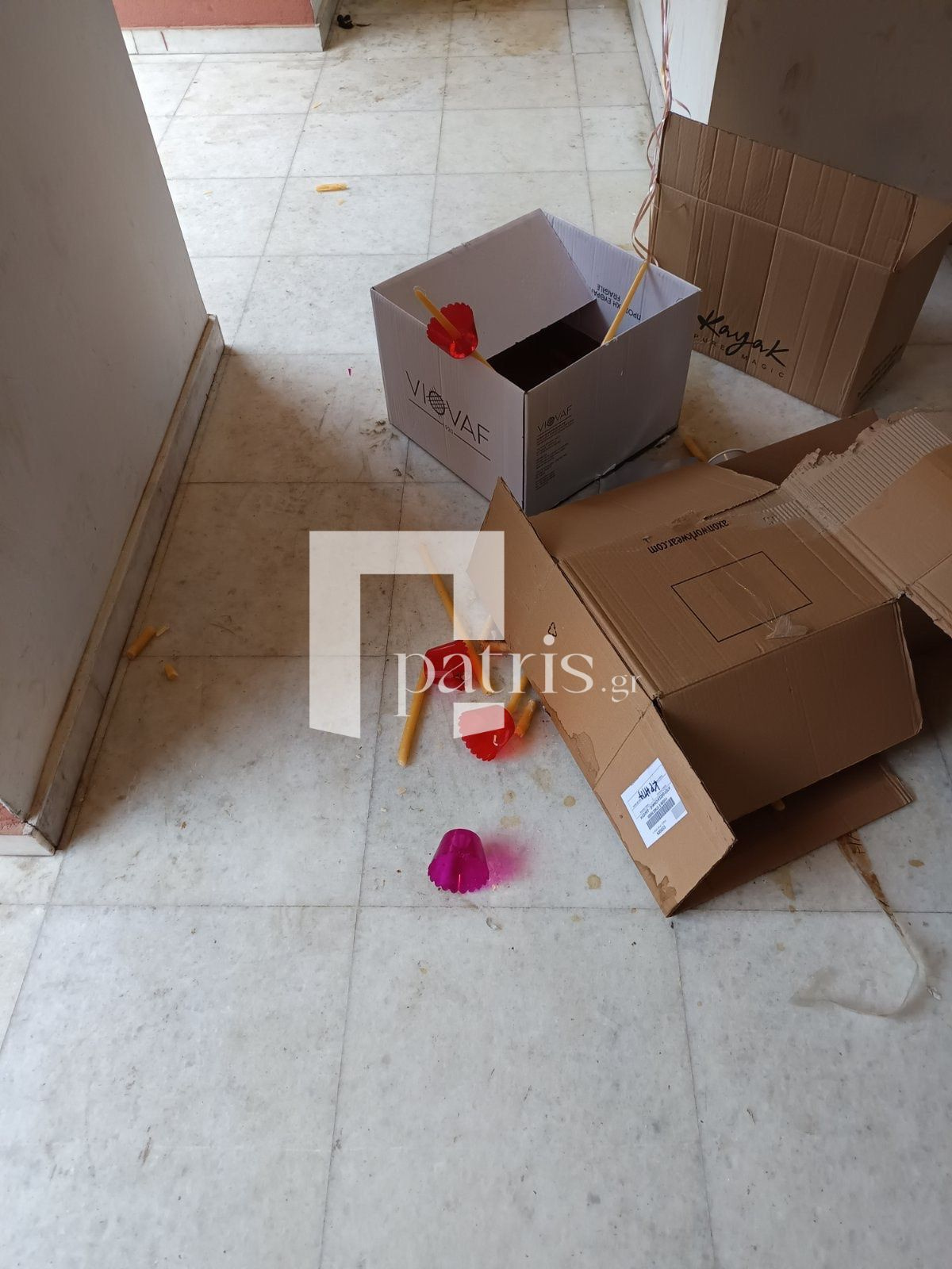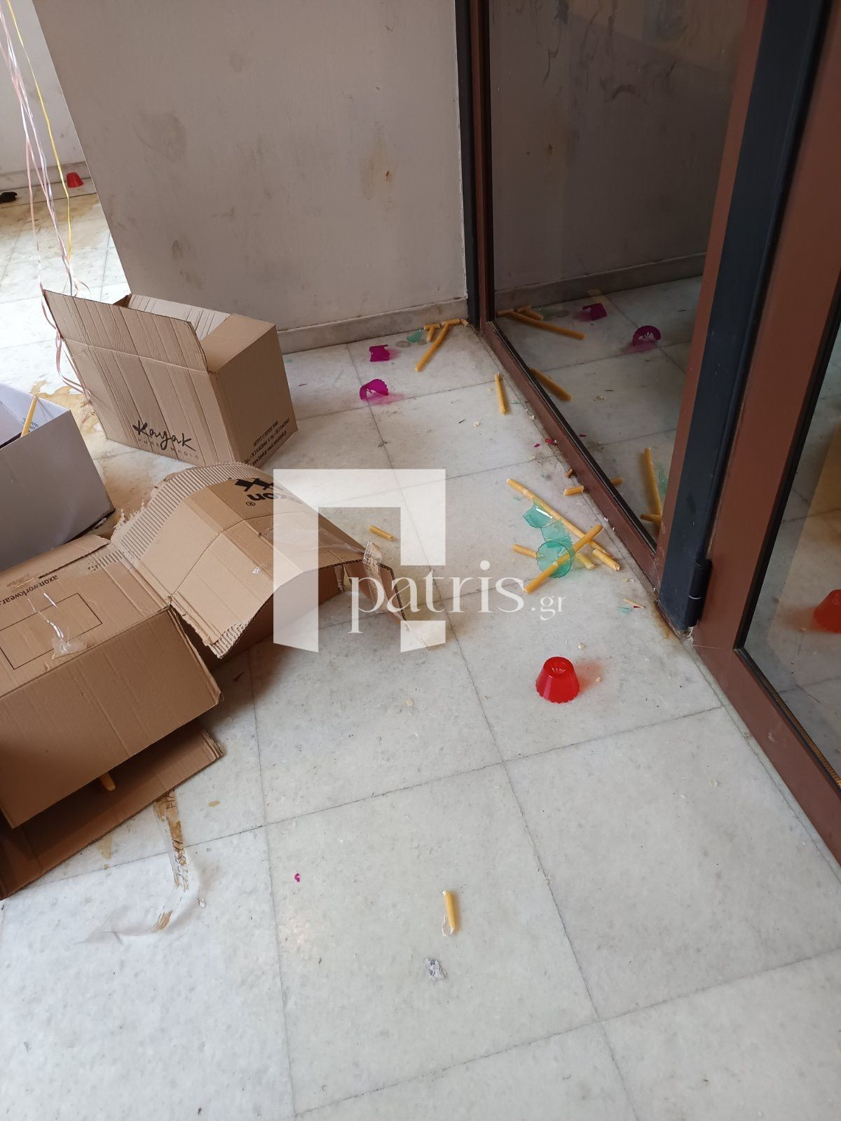 Στη τζαμαρία της εισόδου του κτιρίου, αντίκρυσαν διάφορες χαρακιές ενώ παραδίπλα είχαν αφεθεί χαρτόκουτες με σκουπίδια, ακόμα και λαμπάδες από το βράδυ της Ανάστασης!