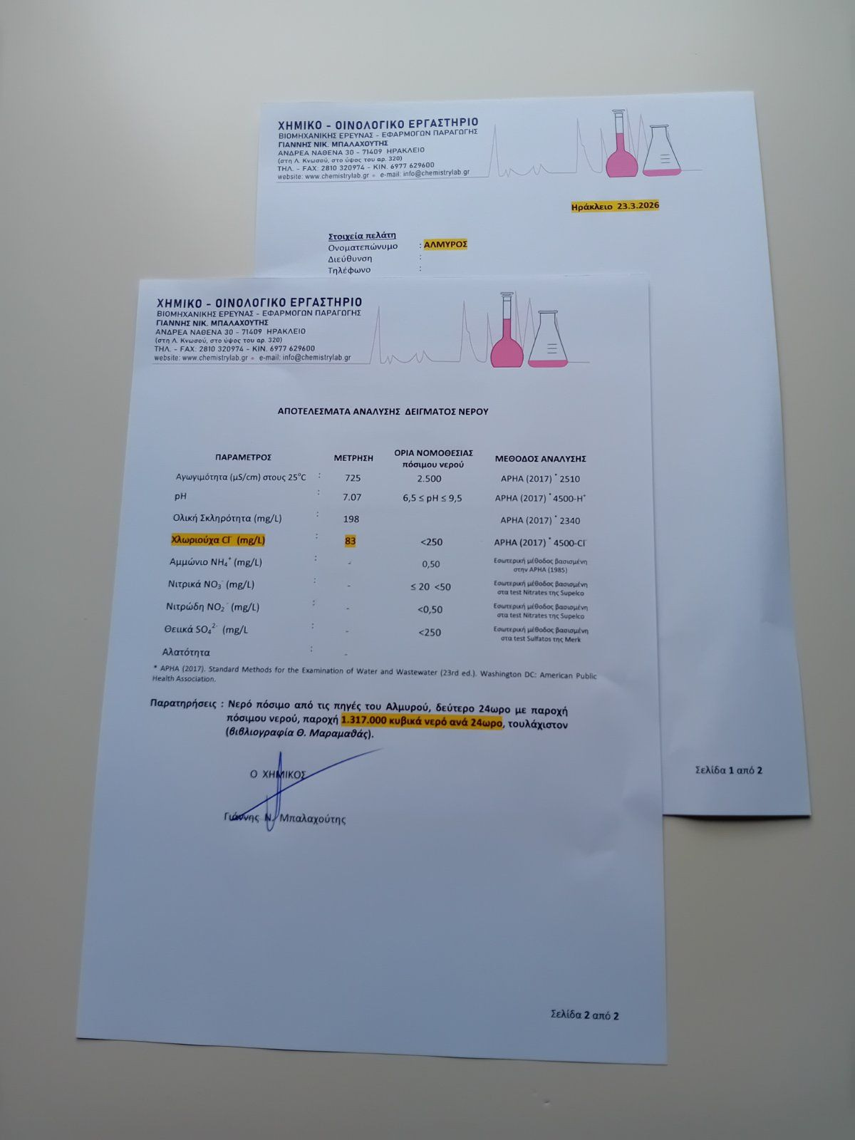 Στις 23 Μαρτίου η αγωγιμότητα ήταν 725, το ph 7,07, η ολική σκληρότητα 198, χλωριούχα 83, και κατέβαζει 1,317 εκατ. κκυβικά γλυκό νερό το 24ωρο.