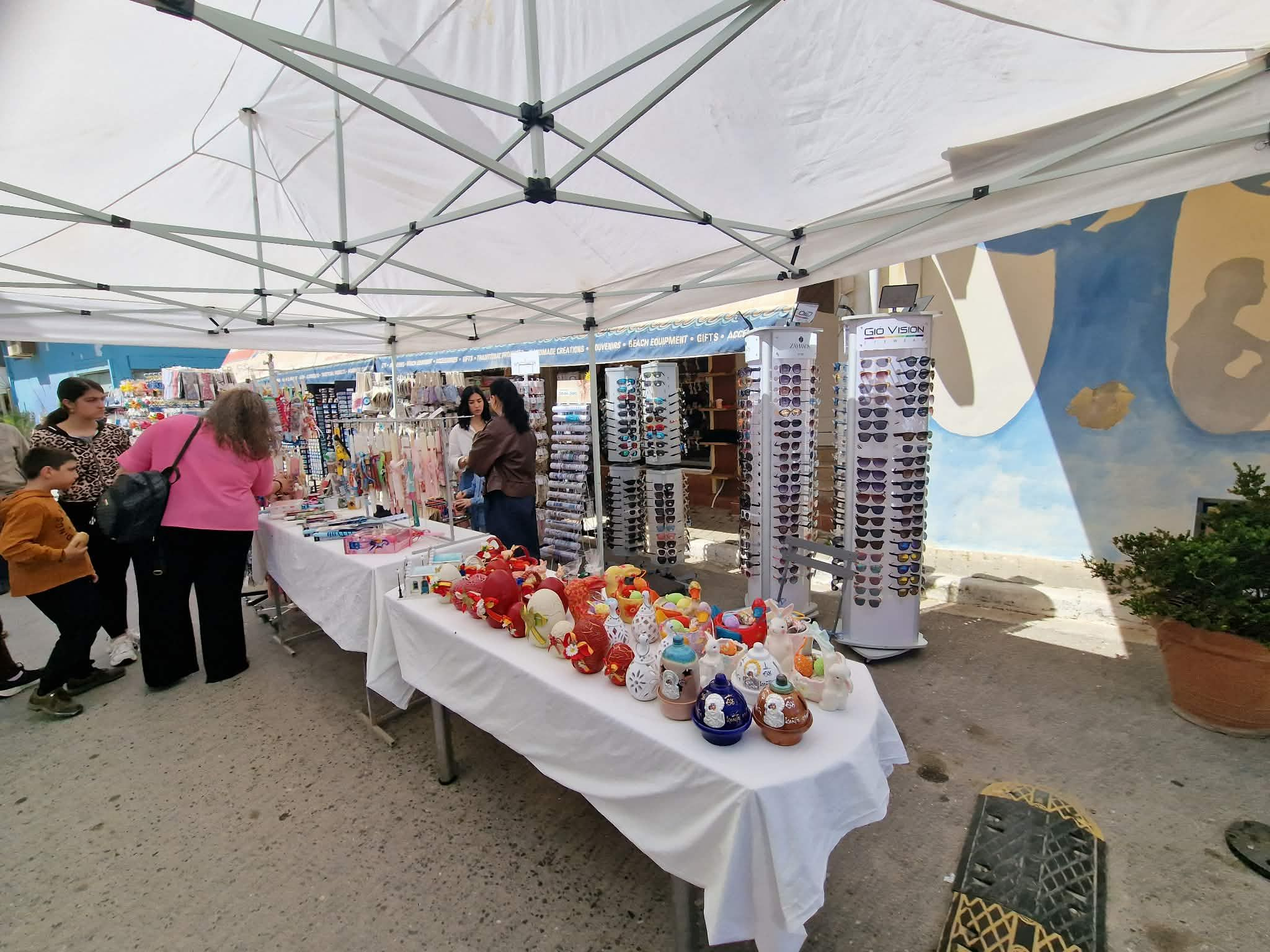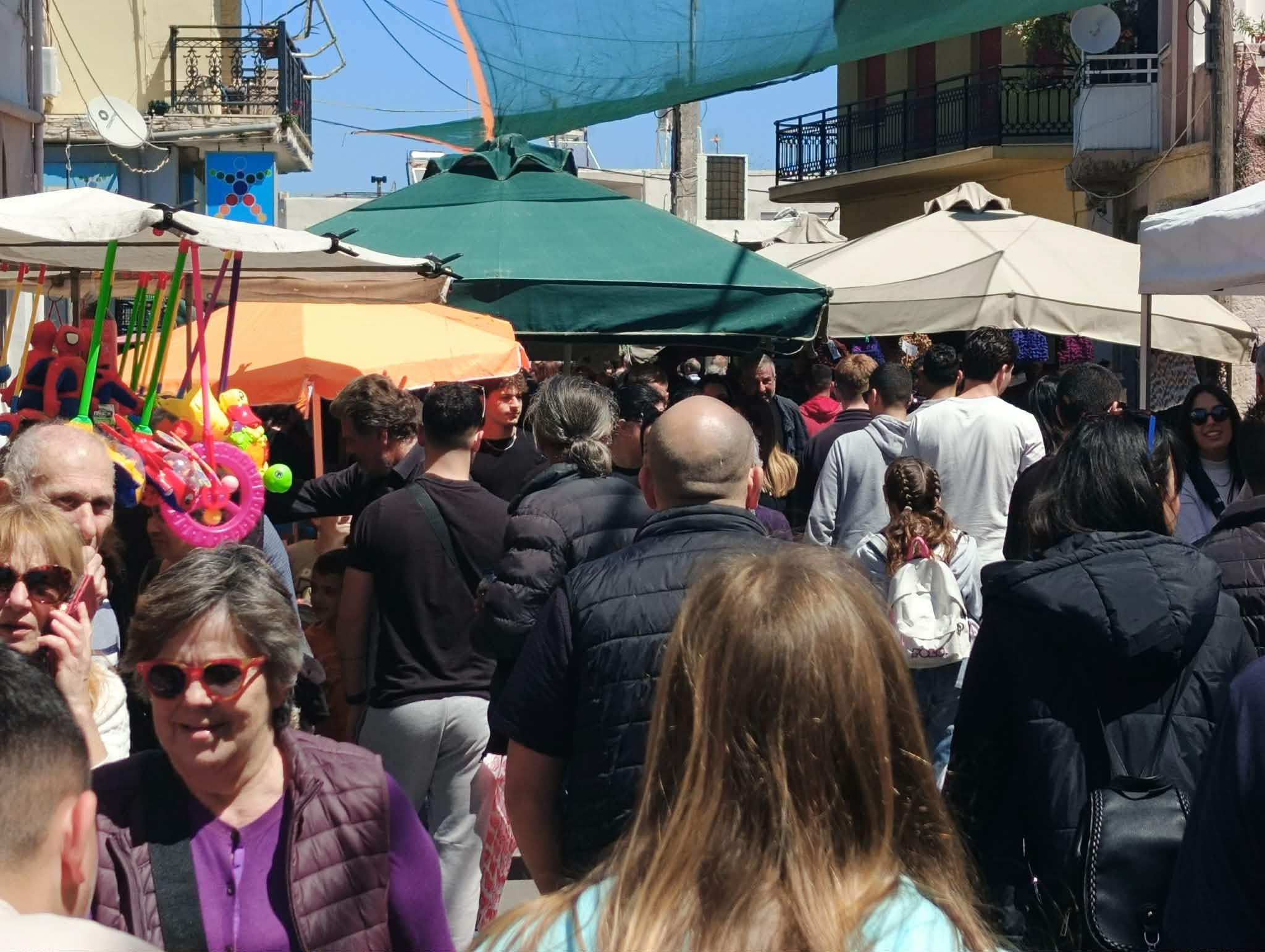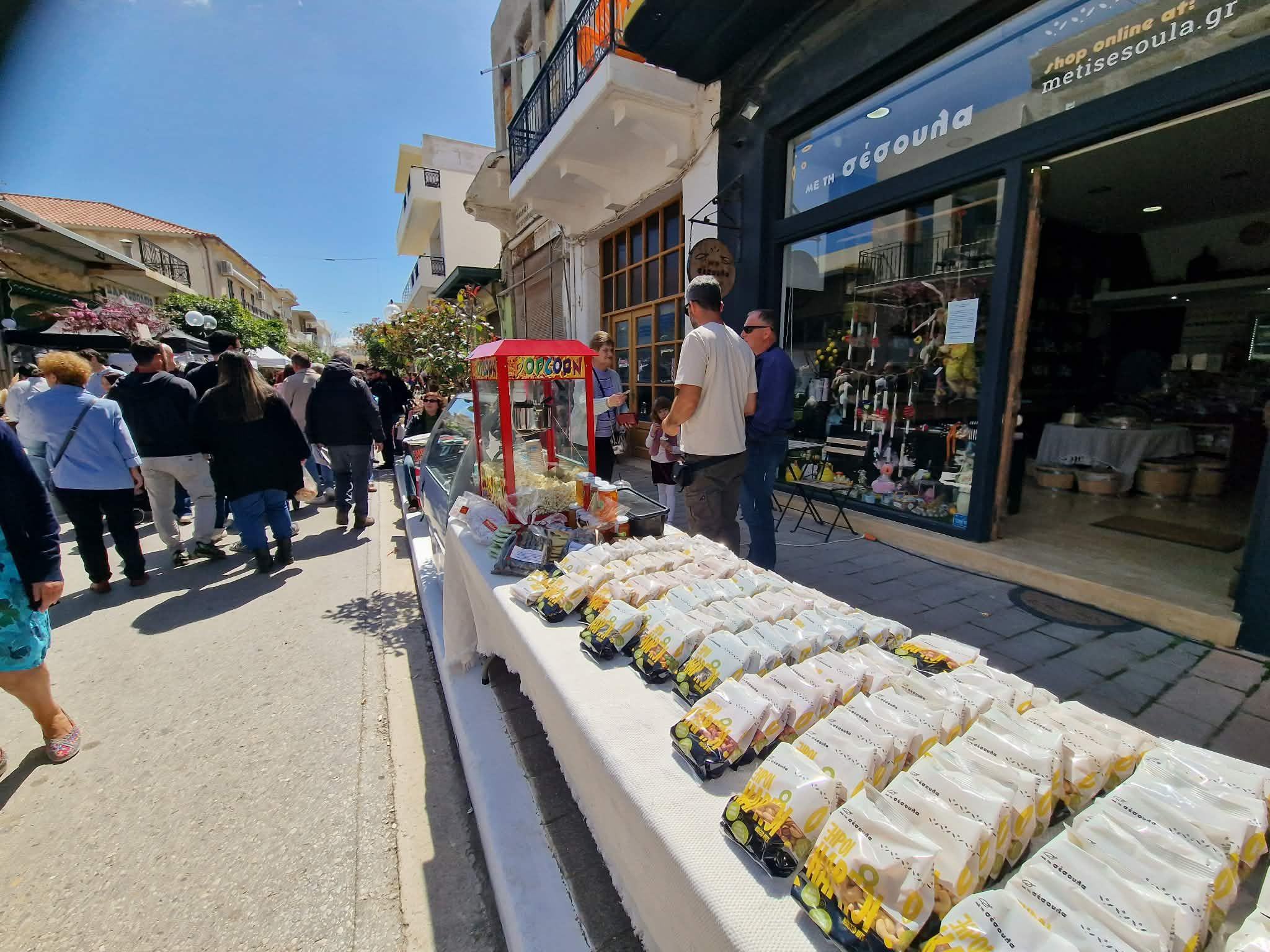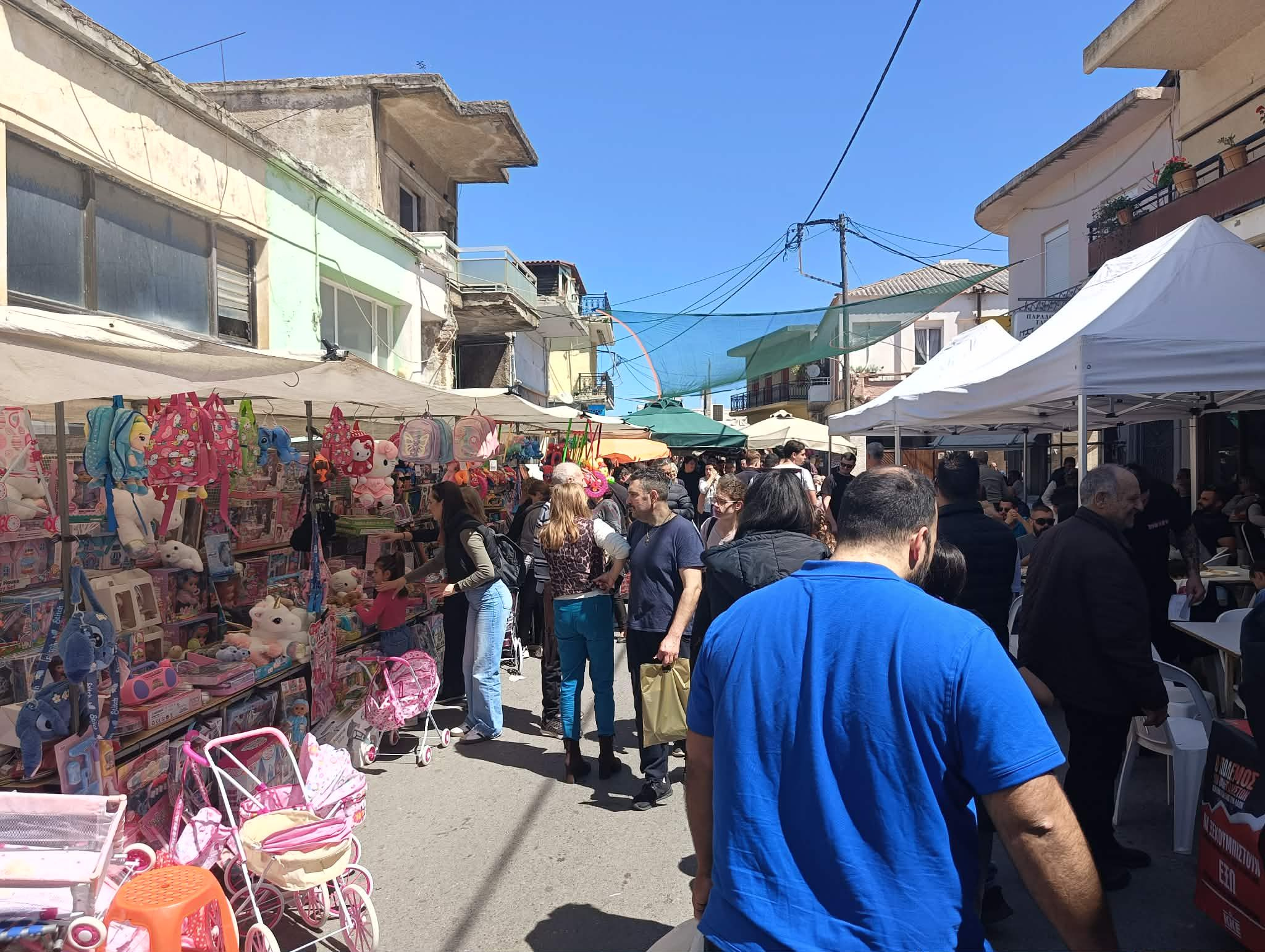 Από νωρίς στήθηκαν οι πάγκοι με κρητικά προϊόντα, ρούχα και πασχαλινά είδη.