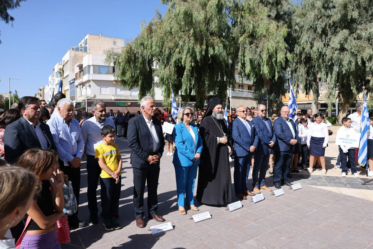 Την επιμνημόσυνη δέηση τέλεσε ο Πρωτοσύγκελος της Ιεράς Αρχιεπισκοπής Κρήτης Βαρθολομαίος Βογιατζόγλου, ενώ στο άγαλμα του Άγνωστου Στρατιώτη, παρουσία των Αντιπεριφερειαρχών Νίκου Συριγωνάκη και Νίκου Ξυλούρη, στεφάνι κατέθεσαν οι: Εντεταλμένη Περιφερειακή Σύμβουλος Παιδείας και δια βίου Μάθησης Ελένη Μαράκη-Μπελαδάκη, Αντιδήμαρχος Παιδείας Δήμου Ηρακλείου Αντώνης Περισυνάκης, Περιφερειακός Διευθυντής Εκπαίδευσης Κρήτης Μανόλης Καρτσωνάκης, εκπρόσωποι Πρωτοβάθμιας και Δευτεροβάθμιας εκπαίδευσης Ηρακλείου, μαθητές του 2ου δημοτικού σχολείου Ηρακλείου και 3ου Λυκείου Ηρακλείου ως εκπρόσωποι των δημοτικών και γυμνασίων-λυκείων Ηρακλείου, εκπρόσωποι Σωμάτων Ελληνικού Οδηγισμού και Προσκόπων.