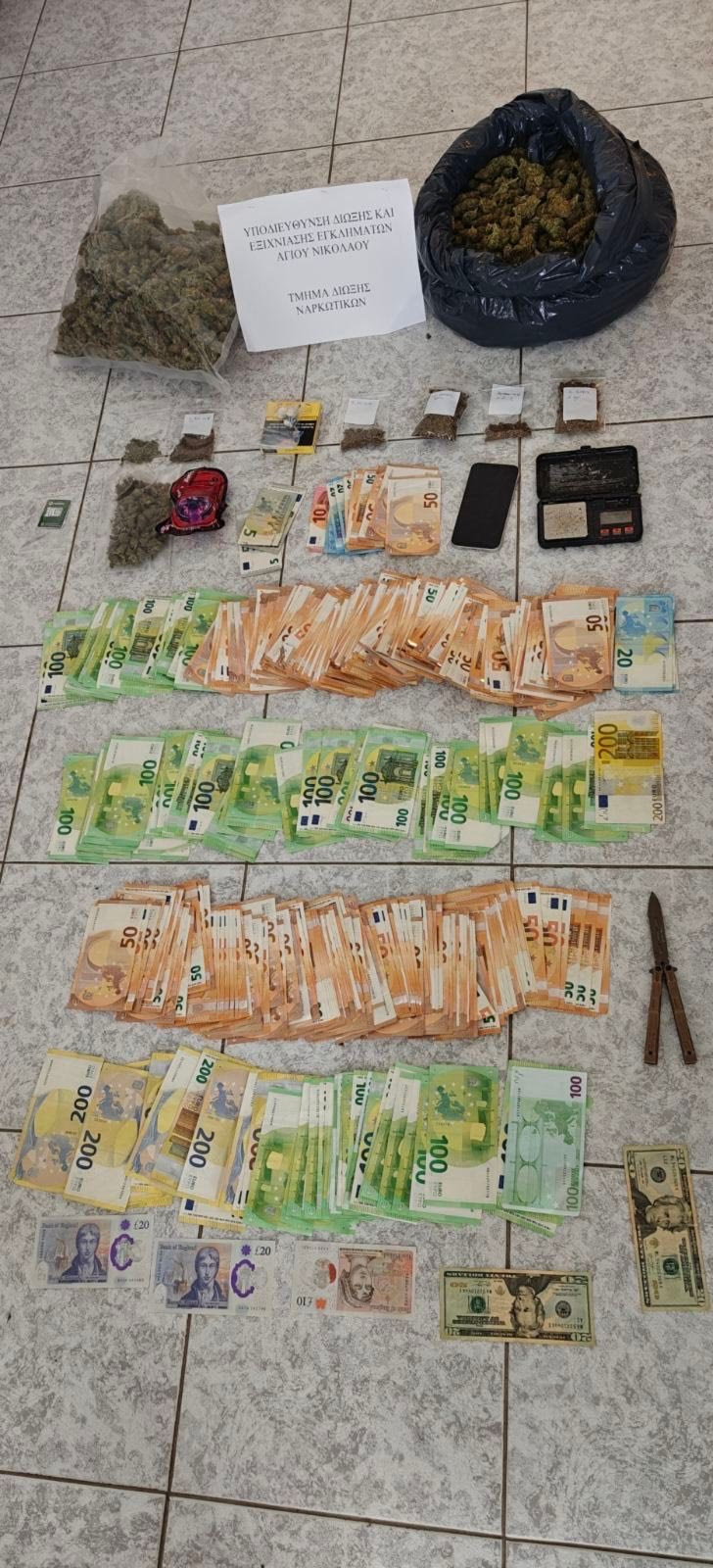 Εκεί βρήκαν και κατάσχεσαν συνολικά: κοντά στα 2 κιλά χασίς, 2,1 γραμμάρια κοκαΐνης, 27.710 ευρώ σε μετρητά, μία ζυγαριά και ένα μαχαίρι.