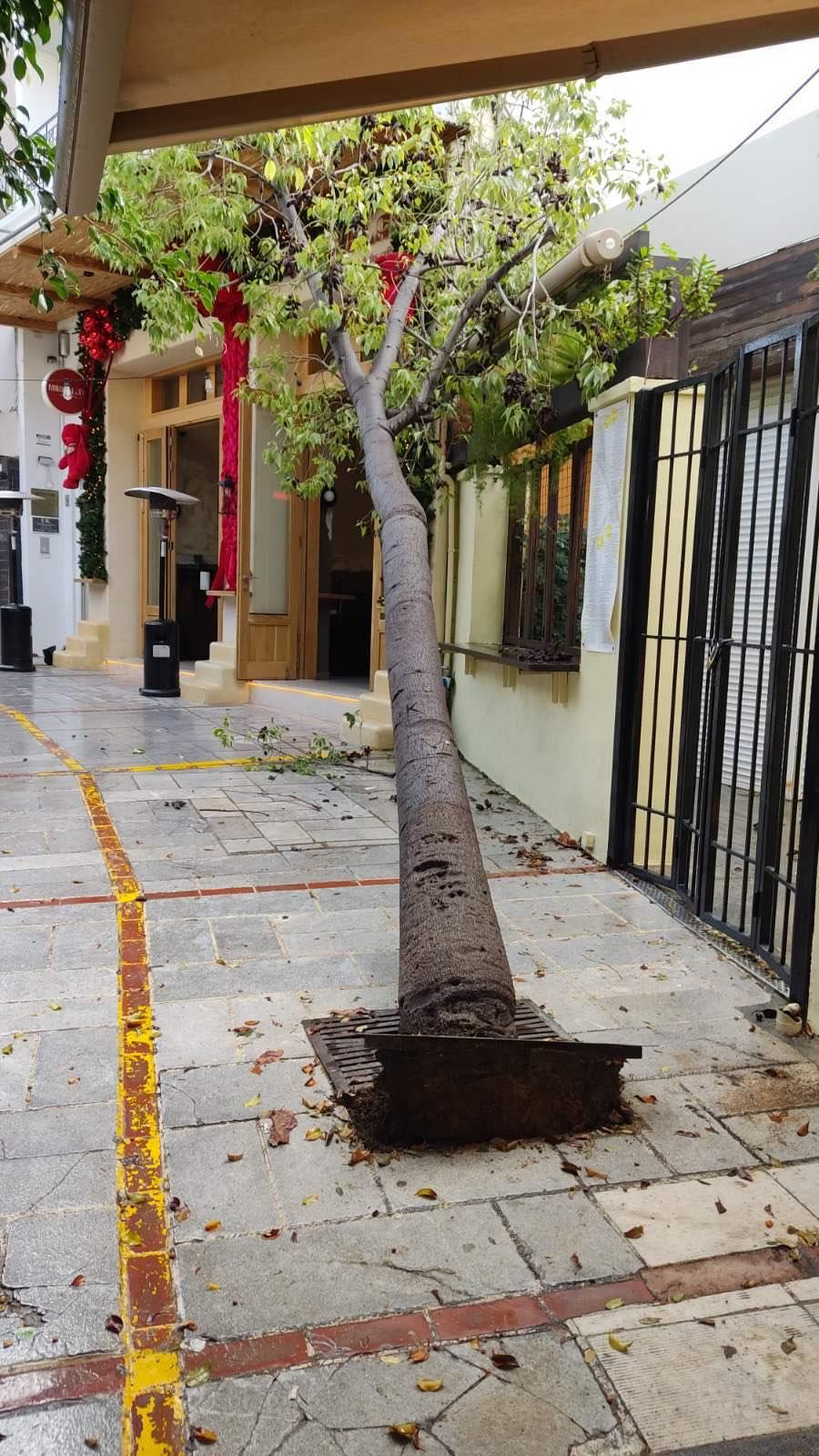 Στην οδό Μιλάτου, ένα δέντρο έπεσε, ενώ η Δημοτική Αστυνομία εξετάζει αν είχε χτυπηθεί από όχημα τροφοδοσίας.