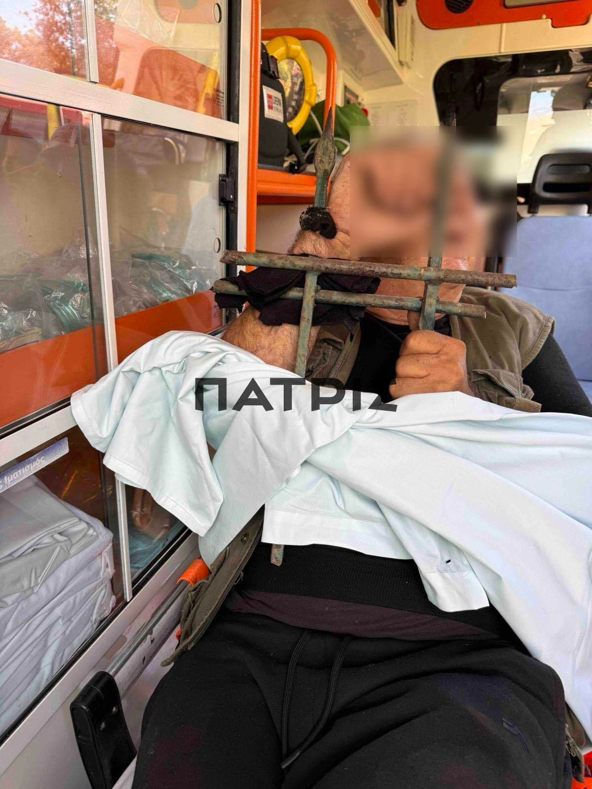 Οι διασώστες της ΕΜΑΚ έκοψαν το σίδερο επιτόπου, ώστε να διασφαλιστεί η ασφαλής μεταφορά του ηλικιωμένου, χωρίς να επιδεινωθεί ο τραυματισμός του.