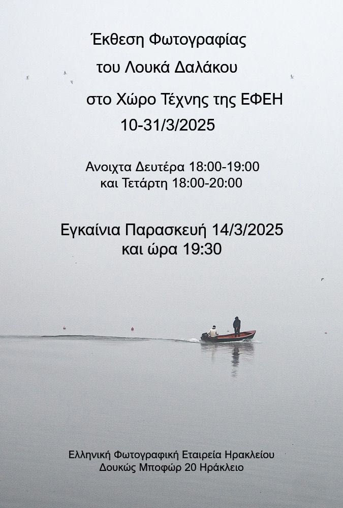 Η Ελληνική Φωτογραφική Εταιρεία Ηρακλείου (Ε.Φ.Ε.Η.), φιλοξενεί τη φωτογραφική έκθεση της Λουκά Δαλάκου.