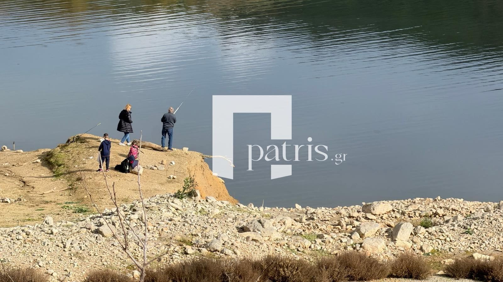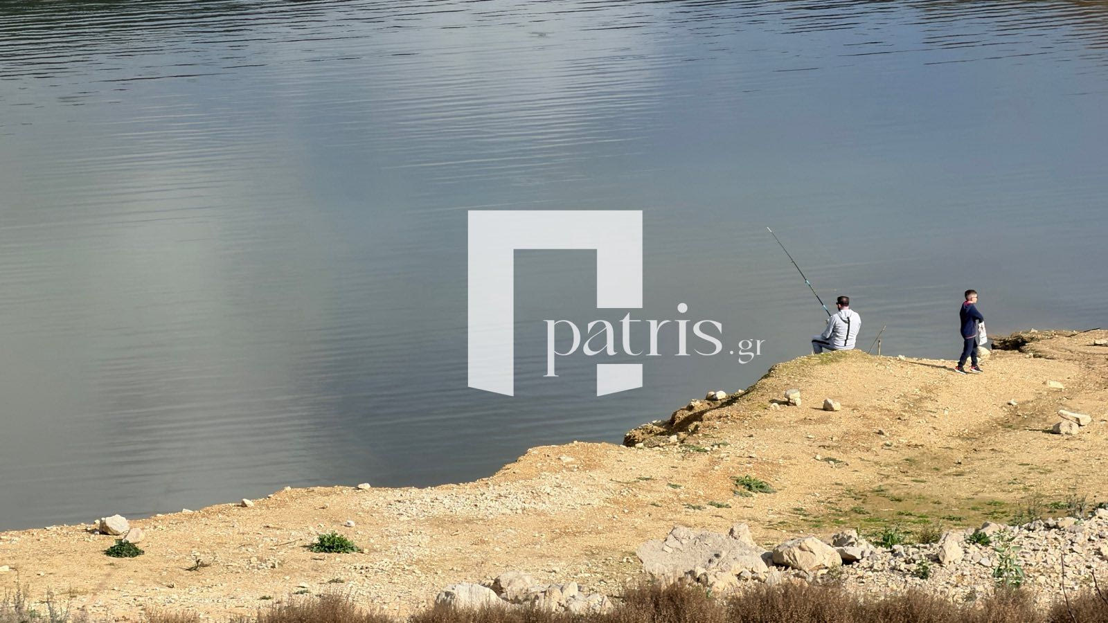 Σε σημεία, το νερό έχει υποχωρήσει τόσο ώστε πολίτες φτάνουν πλέον με τα πόδια στην άκρη του τεχνητού φράγματος, ακόμη και για ψάρεμα.