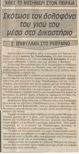 «Κρητική βεντέτα αναβίωσε χθες το μεσημέρι στο Εφετείο του Πειραιά, όταν ο Ιωάννης Εμ. Παπαδόσηφος, 62 ετών σκότωσε μεπιστόλι τον δολοφόνο του γιού του Ιωάννη Μ. Βενιεράκη, 37 ετών, λίγο πριν εκδικασθεί η έφεση, που είχε ασκήσει ο δεύτερος. Το έγκλημα διαπράχθηκε στις 12.10′ το μεσημέρι σε διάδρομο του Δικαστικού Μεγάρου του Πειραιά, στην οδό Σκουζέ, καθώς ο ισοβίτης Βενιεράκης, προσαγόταν σε αίθουσα του β’ ορόφου, όπου θα εκδικαζόταν η έφεση του.