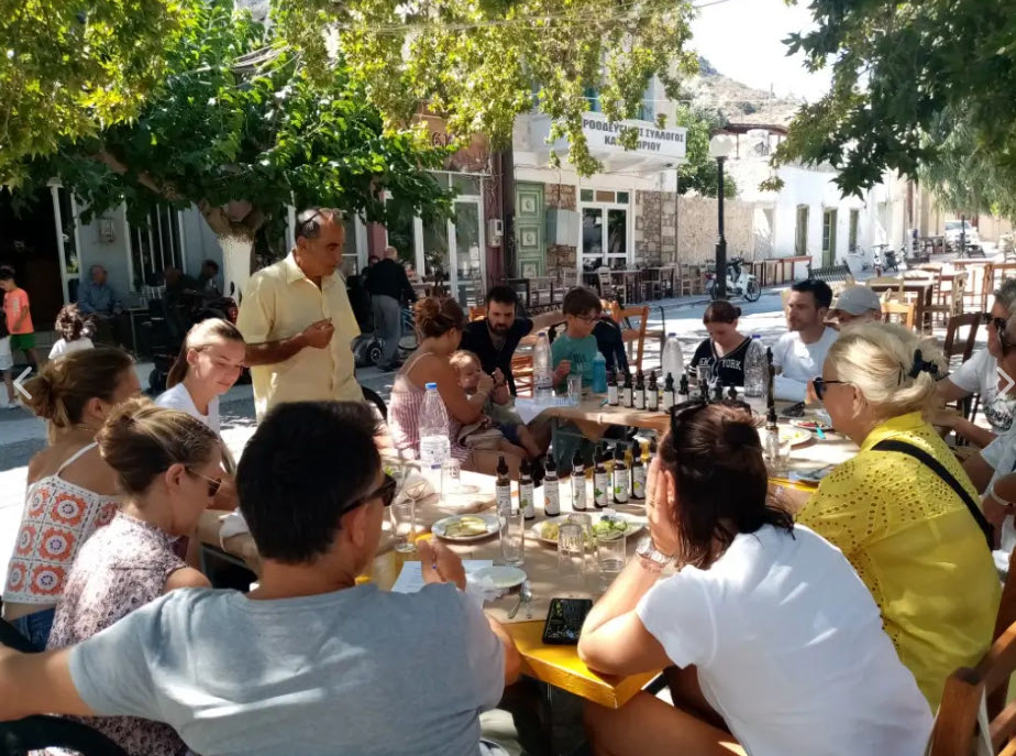 Στην συνέχεια, τους προσφέρεται κέρασμα στην πλατεία του χωριού με γευσιγνωσία αρωματικών ελαιολάδων τα οποία μπορούν να αγοράσουν φεύγοντας.
