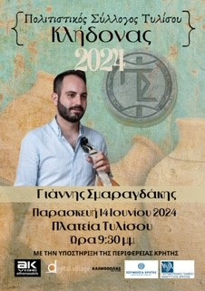 Ο πολιτιστικός σύλλογος Τυλίσου διοργανώνει με τη στήριξη της Περιφέρειας Κρήτης τη γιορτή του Κλήδονα την Παρασκευή 14 Ιουνίου και ώρα 21.30 στη πλατεία του χωριού με πολύ τραγούδι και χορό.