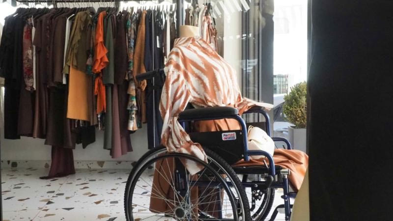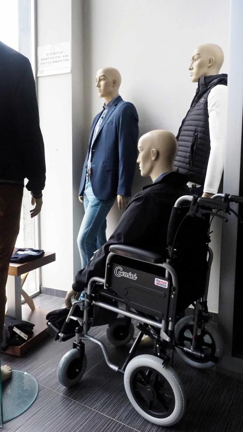 Αναπηρικά αμαξίδια ‒προσφερόμενα από εταιρείες, φορείς και πολίτες‒ στέκονται στατικά σε βιτρίνες καταστημάτων, δίπλα σε ρούχα, παπούτσια, λευκά είδη, αντικείμενα της καθημερινότητας.