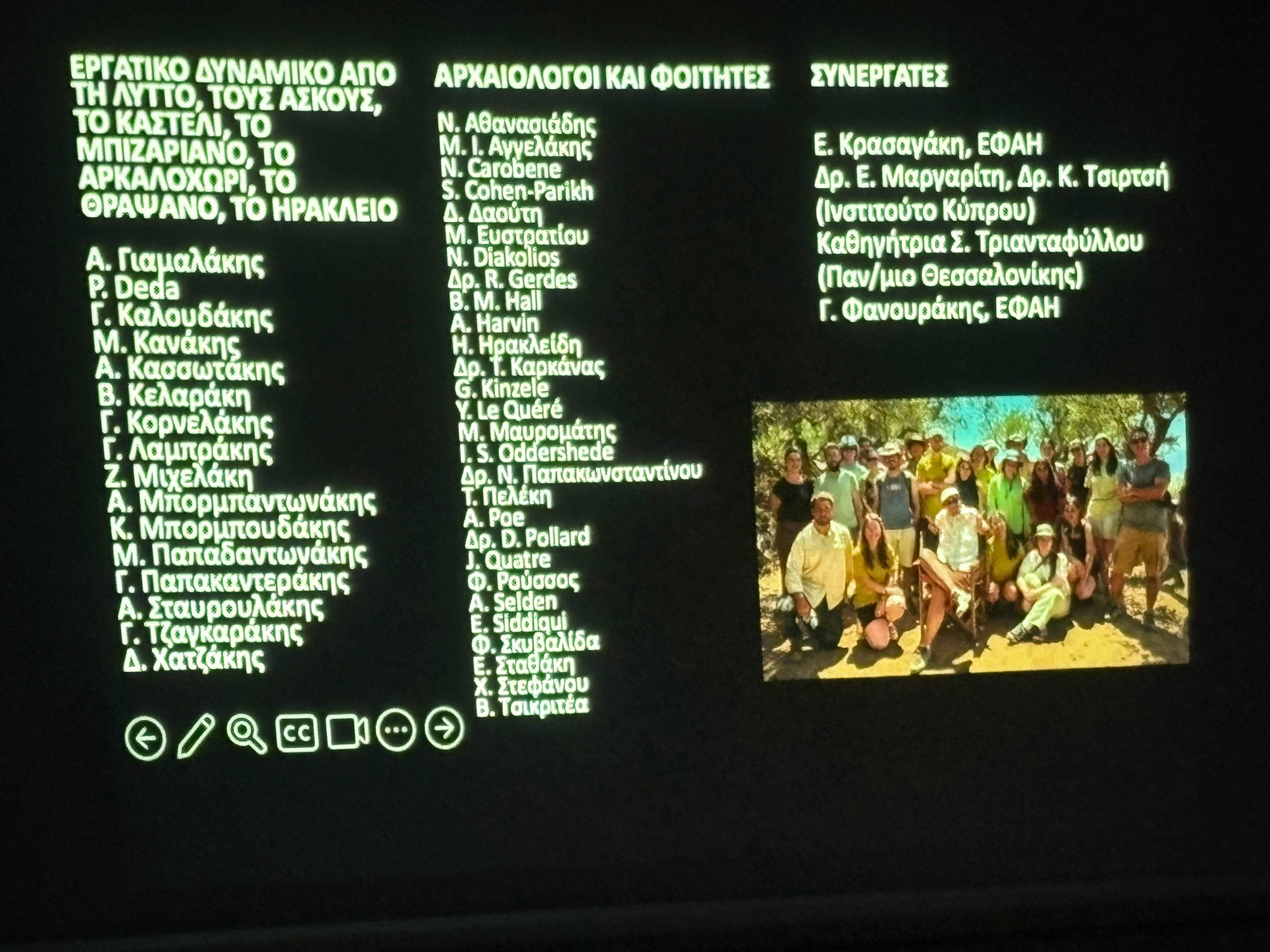 Οι συνδιευθυντές της ανασκαφής, η Προϊσταμένη της Εφορείας Αρχαιοτήτων Ηρακλείου Δρ. Βάσω Συθιακάκη, ο Καθηγητής Αρχαίας Ιστορίας και Κλασικών Σπουδών στο Ινστιτούτο Προηγμένων Σπουδών στο Πρίνστον των Η.Π.Α. Άγγελος Χανιώτης και ο Καθηγητής Αρχαιολογίας του Πανεπιστημίου της Νέας Υόρκης Αντώνης Κοτσώνας, παρουσίασαν τα συναρπαστικά ευρήματα της φετινής ανασκαφικής περιόδου, επιβεβαιώνοντας την τεράστια ιστορική και αρχαιολογική σημασία της περιοχής.