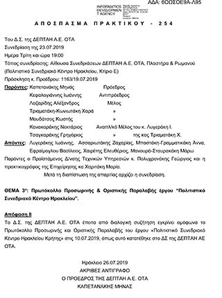 Σας κοινοποιώ τέλος και την υπό στοιχεία ΑΔΑ: 6ΟΩΣΟΕ9Α-Λ95 Απόφαση του Διοικητικού Συμβουλίου της ΔΕΠΤΑΗ δημοσιευμένη στη ΔΙΑΥΓΕΙΑ της 23.07.2019, (ΣΥΝΗΜΜΕΝΟ 4) με την οποία Απόφαση, εγκρίθηκε το Πρωτόκολλο Προσωρινής και Οριστικής παραλαβής του έργου της Α φάσης του ΠΣΚΗ, προκειμένου να ενημερώσετε την «καλή» συντάκτη σας αλλά και τους αναγνώστες σας αν το κρίνετε αναγκαίο.