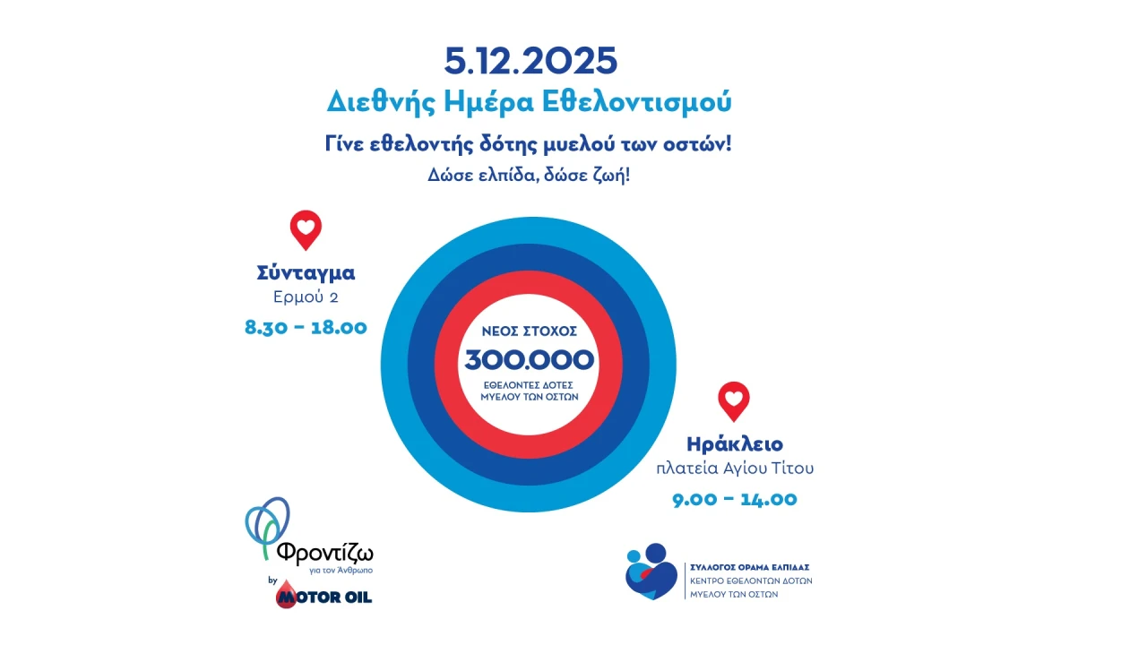 Με αφορμή τη Διεθνή Ημέρα Εθελοντισμού, ο Όμιλος Motor Oil, στο πλαίσιο της πρωτοβουλίας κοινωνικής συνεισφοράς του «Φροντίζω», μαζί με τον Σύλλογο «ΟΡΑΜΑ ΕΛΠΙΔΑΣ» διοργανώνουν μεγάλη δράση ενημέρωσης και εγγραφής εθελοντών δοτών μυελού των οστών, την Παρασκευή 5 Δεκεμβρίου 2025, σε Αθήνα και Ηράκλειο Κρήτης.