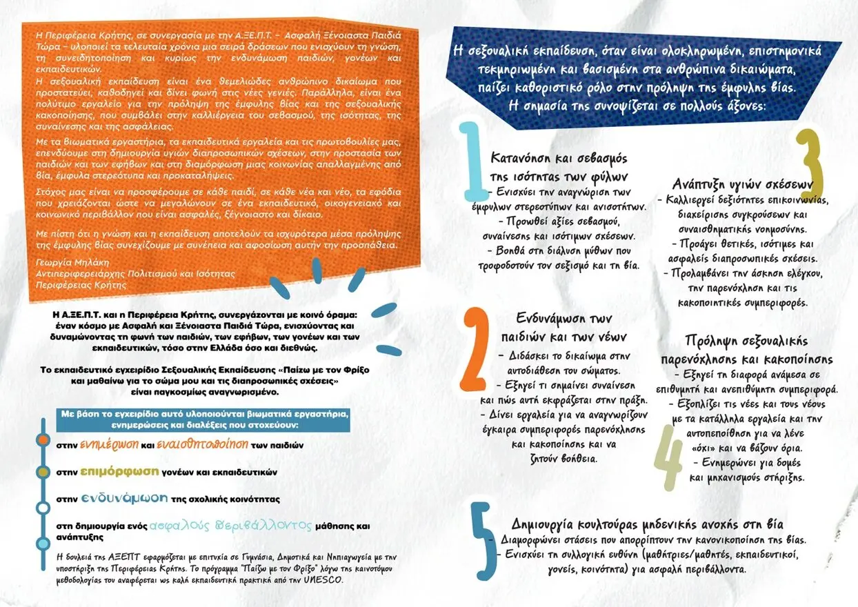 Η Περιφέρεια Κρήτης, Αυτοτελές Γραφείο Ισότητας, σε συνεργασία με την Α.ΞΕ.Π.Τ. – Ασφαλή Ξέγνοιαστα Παιδιά Τώρα – υλοποιούν τα τελευταία χρόνια μια σειρά δράσεων σεξουαλικής εκπαίδευσης που ενισχύουν τη γνώση, τη συνειδητοποίηση και κυρίως την ενδυνάμωση παιδιών, γονέων και εκπαιδευτικών, σε συνεργασία με συλλόγους εκπαιδευτικών, συλλόγους γονέων και κηδεμόνων και πολιτιστικούς συλλόγους.