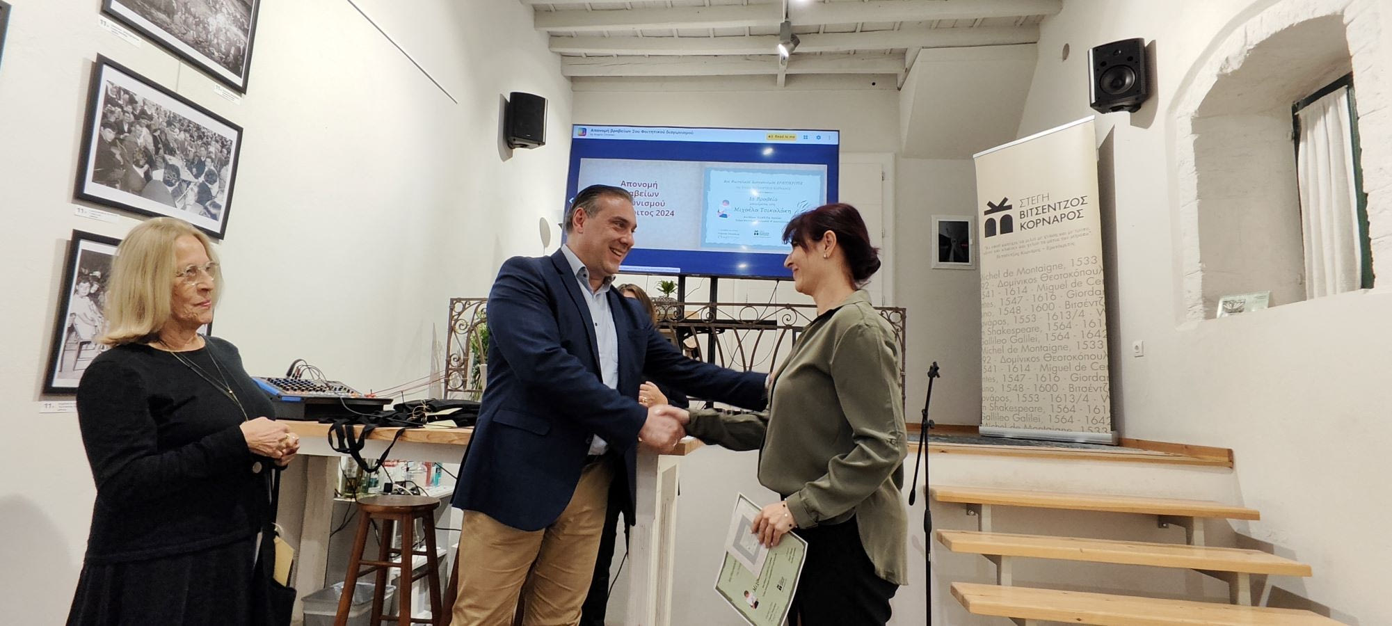 Ο Αντιπεριφερειάρχης απένειμε το πρώτο βραβείο στην φοιτήτρια Μιχαέλα Τσικαλάκη και συνεχάρη όλους τους φοιτητές που συμμετείχαν στον διαγωνισμό, όπως επίσης τους καθηγητές του Τμήματος Επιστήμης Διατροφής και Διαιτολογίας του ΕΛΜΕΠΑ, για την θερμή υποστήριξη που πρόσφεραν. Ευχαρίστησε επίσης τον πρόεδρο Γιώργο Γαλανάκη και τα μέλη της Στέγης «Βιτσέντζος Κορνάρος», για το έργο και την συμβολή τους στην προώθηση του κρητικού πολιτισμού.