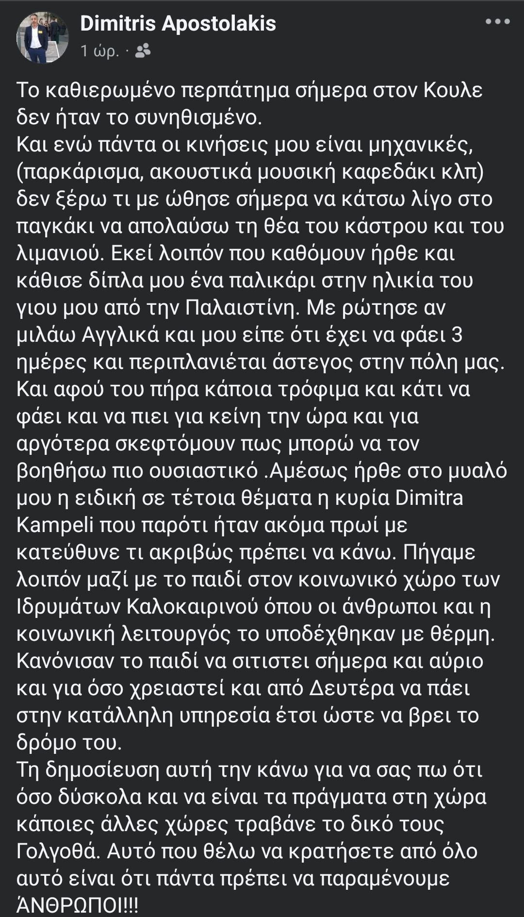 Ο κ. Αποστολάκης αναφέρει στην ανάρτησή του ότι καθόταν όπως συνηθίζει σε παγκάκι απέναντι από τον Κούλε και κοίταζε τη θέα, ώσπου ένα παιδί από την Παλαιστίνη τον πλησίασε και τον ρώτησε αν μιλάει αγγλικά.