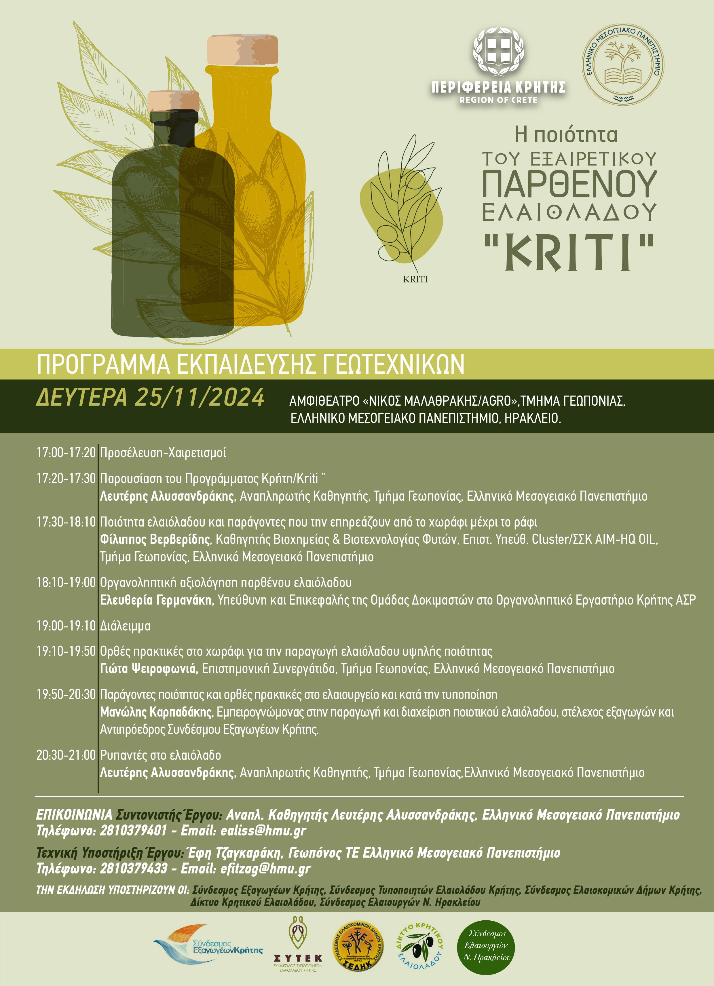 Η Περιφέρεια Κρήτης και το Ελληνικό Μεσογειακό Πανεπιστήμιο, διοργανώνουν εσπερίδα για την ποιότητα του Εξαιρετικού Παρθένου Ελαιόλαδου “ Κρήτη / Kriti” η οποία θα πραγματοποιηθεί την Δευτέρα 25 Νοεμβρίου 2024, στις 17:00 μ.μ, στο Αμφιθέατρο «ΝΙΚΟΣ ΜΑΛΑΘΡΑΚΗΣ/AGRO», στο Τμήμα Γεωπονίας, στο Ελληνικό Μεσογειακό Πανεπιστήμιο.
