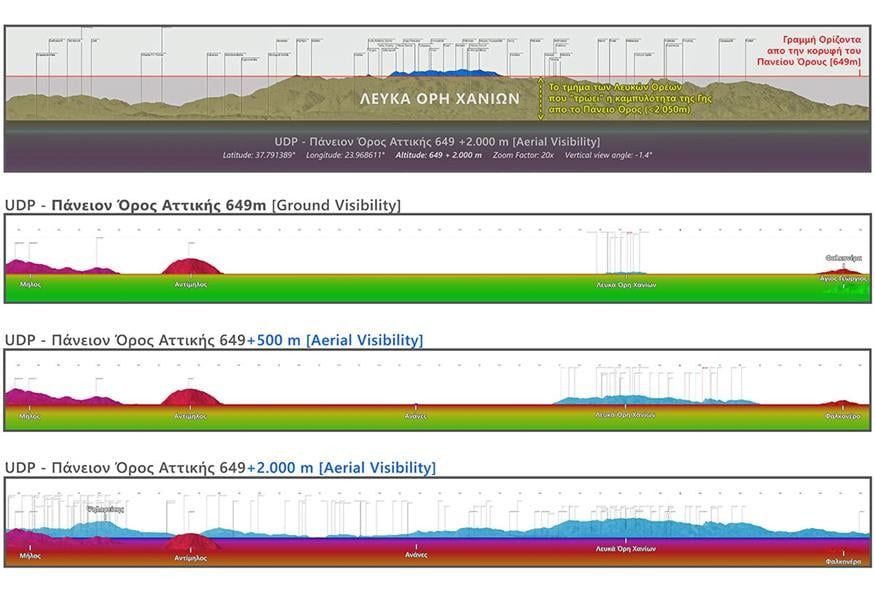 Στο 1ο σχεδιάγραμμα στην πάνω φωτογραφία βλέπουμε το τι ακριβώς μας «κόβει» η καμπυλότητα της Γης, στο 2ο απεικονίζεται πανοραμικό σχεδιάγραμμα ορατότητας στο πραγματικό υψόμετρο του Όρους (649m), στο 3ο η ορατότητα +500m πάνω απο την κορυφή του Όρους (όπου βλέπουμε και τις βραχονησίδες Ανανές της Μήλου), στο 4ο η ορατότητα +2.000m πάνω απο την κορυφή του Όρους (όπου παρατηρείται και ο Ψηλορείτης πίσω απο το Όρος Κατσιπάρδος της Μήλου).