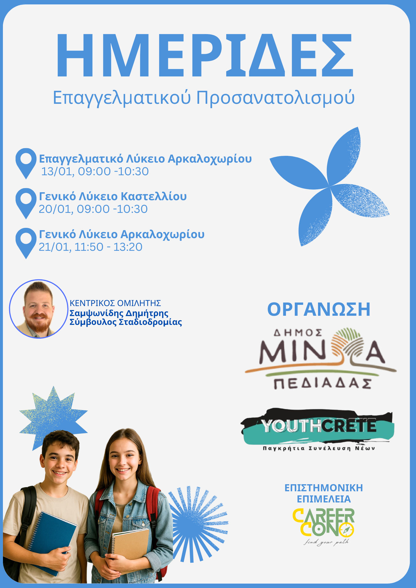 Ο Δήμος Μινώα Πεδιάδας διοργανώνει Ημερίδες Επαγγελματικού Προσανατολισμού για Μαθητές Λυκείου σε συνεργασία με το Youth Crete, μια πρωτοβουλία της Περιφέρειας Κρήτης για τους νέους.