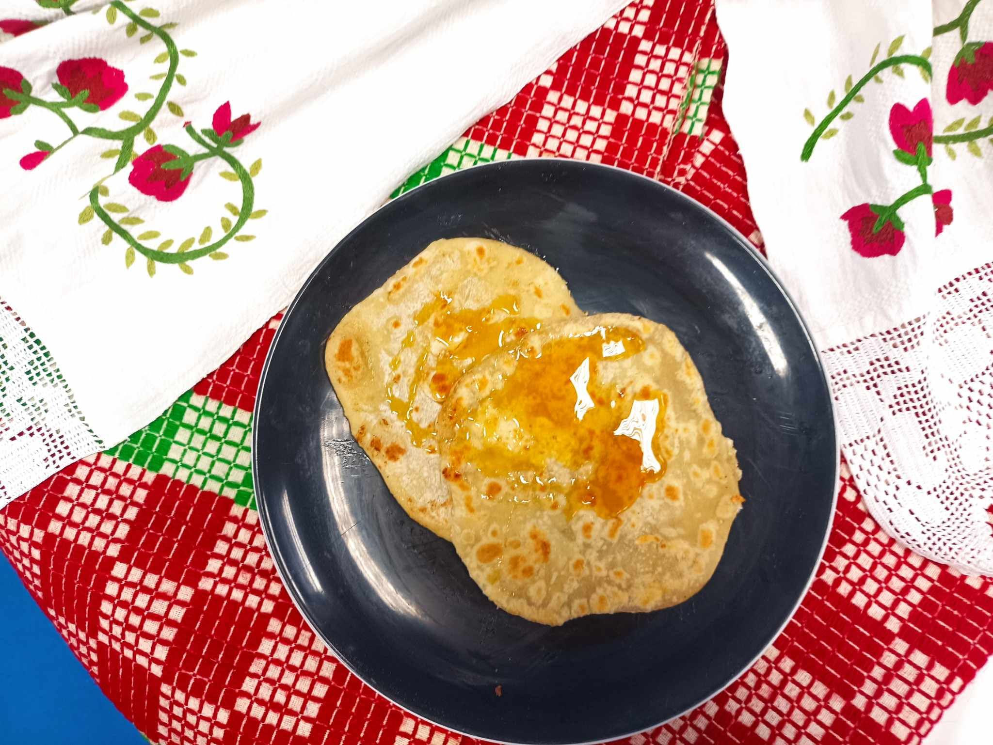 Για τον τρόπο που φτιάχνει τη ζύμη είπε ότι βάζει χλιαρό νερό, ένα σφηνάκι ελαιόλαδο, ένα σφηνάκι ρακή και αλεύρι για όλες τις χρήσεις. Φτιάχνει μια ζύμη μαλακή, να ξεκολά από την λεκάνη που ζυμώθηκε και να μην κολλά στα χέρια. Στη συνέχεια φτιάχνει βολαράκια με τη ζύμη ανοίγει φύλλο βάζει τη μυζήθρα, κλείνει την πίτα και ανοίγει ξανά το ζυμάρι με τα χέρια ή με το ξυλίκι. Η πίτα τηγανίζεται σε καυτό ελαιόλαδο και περιχύνεται με μέλι πριν φαγωθεί.