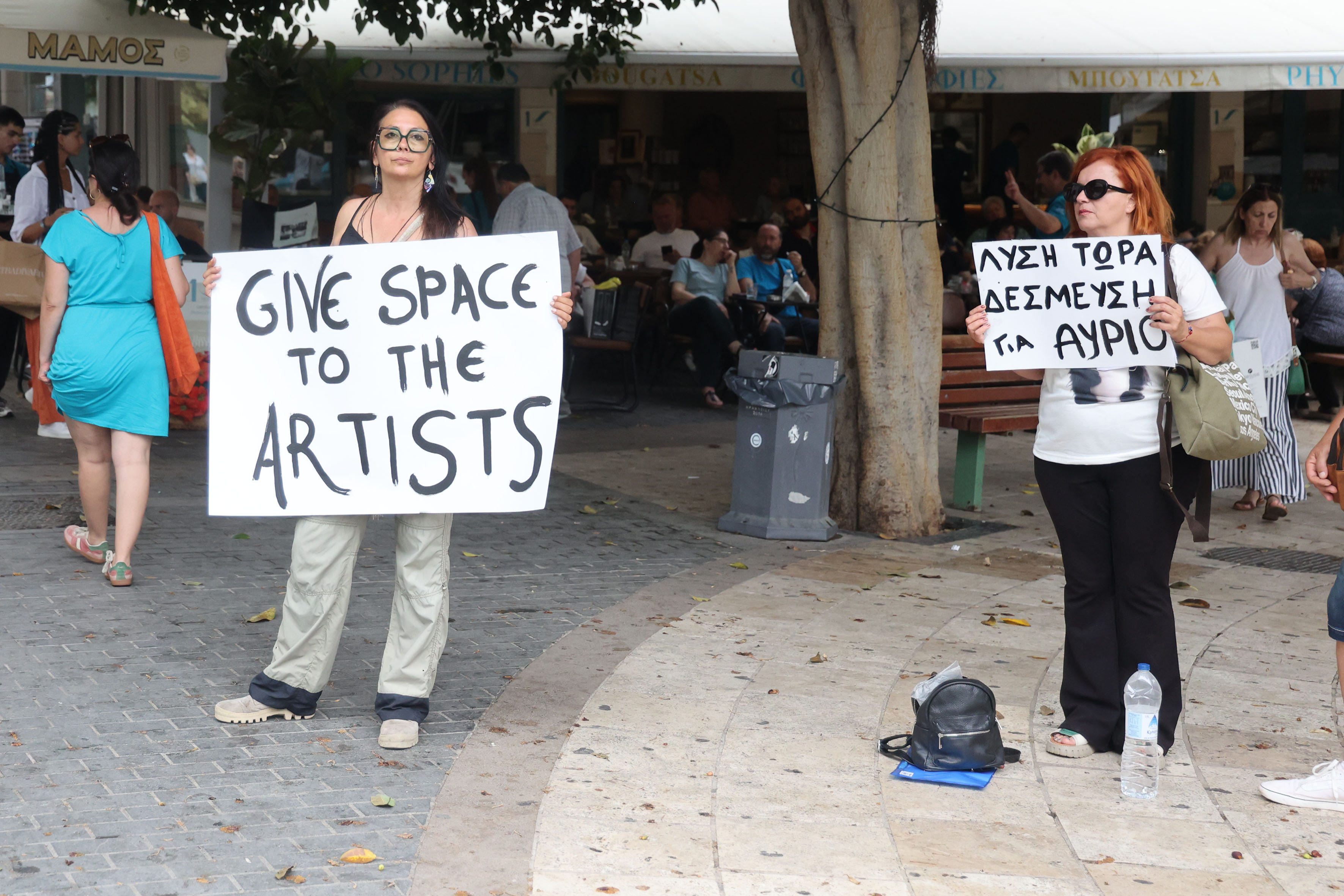 Με πλακάτ, και πανό διαμαρτυρήθηκαν στην πλατεία των Λιονταριών, ενώ παράλληλα συγκεντρώνουν και υπογραφές συμπαράστασης από τους περαστικούς σε ψήφισμα που έχουν εκδώσει με το οποίο ζητούν από το Δήμο να τους επιτρέψει να συνεχίσουν να εργάζονται στα σημεία που σήμερα βρίσκονται τονίζοντας χαρακτηριστικά ότι «ο δρόμος είναι η ζωή μας και η τέχνη η επιβίωση μας».
