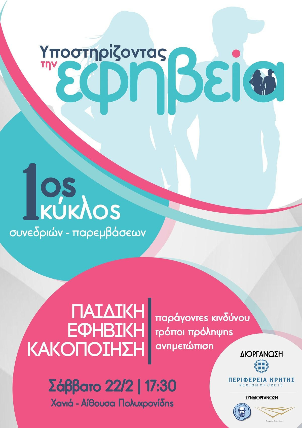 Σε συνεργασία με τον τομέα Ψυχιατρικής και Επιστημών της Συμπεριφοράς της Ιατρικής Σχολής του Πανεπιστημίου Κρήτης και το Πνευματικό Κέντρο Χανίων υλοποιείται ένα ακόμα πρωτοποριακό επιστημονικό πρόγραμμα με τίτλο “Υποστηρίζοντας την Εφηβεία”, σε μια προσπάθεια ενίσχυσης της καθολικής πρόσβασης στις πολιτικές πρόληψης και ταυτόχρονα, μέσα από την κινητοποίηση όλων των φορέων, δημιουργίας ενός δικτύου προστασίας για παιδιά και εφήβους, προλαμβάνοντας, πριν την εκδήλωσή τους, τα φαινόμενα παιδικής και εφηβικής κακοποίησης.