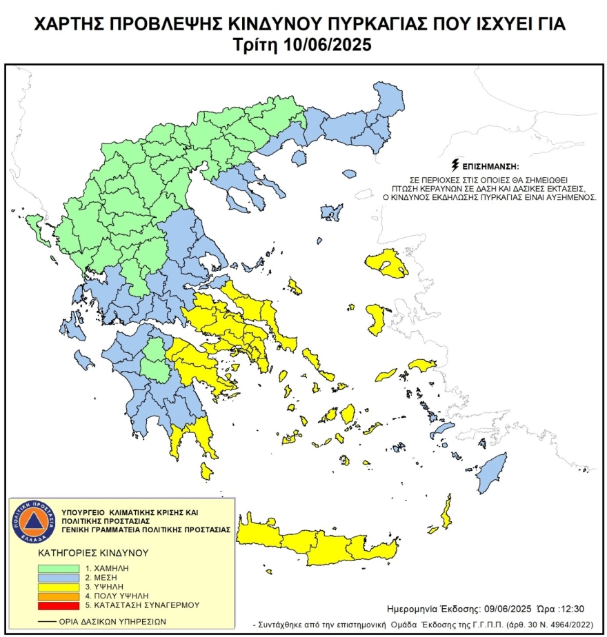 Υψηλός κίνδυνος πυρκαγιάς (κατηγορία κινδύνου 3) για 18 περιφέρειες της χώρας προβλέπεται για αύριο Τρίτη 9 Ιουνίου 2025, σύμφωνα με τον Χάρτη Πρόβλεψης Κινδύνου Πυρκαγιάς, που εξέδωσε η ΓΓ Πολιτικής Προστασίας.