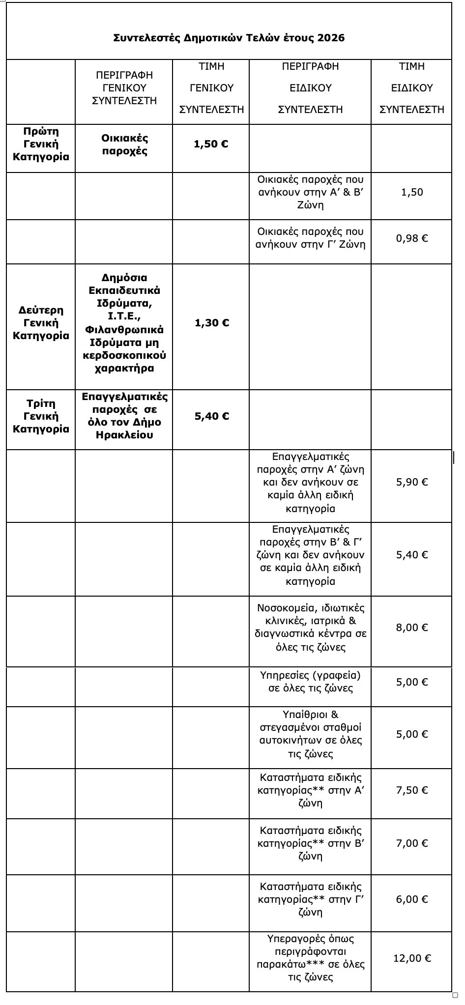 Με αυτή την αναπροσαρμογή, μια οικογένεια που διαμένει στο Ηράκλειο σε διαμέρισμα 100 τ.μ. και πληρώνει σήμερα 8,75 ευρώ/μήνα Δημοτικά Τέλη, θα έχει μηνιαία επιβάρυνση 3,75 ευρώ.